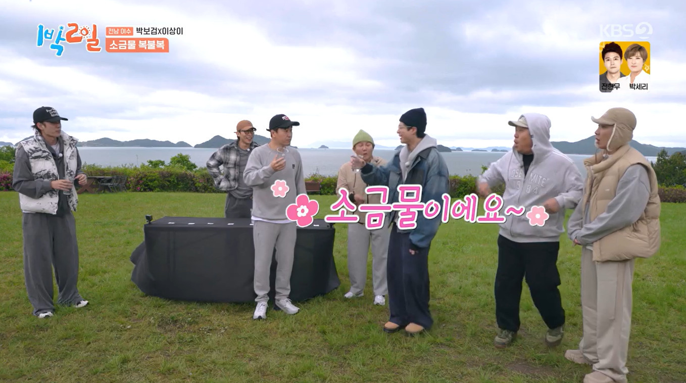 KBS2TV'1박2일시즌4'8일방송KBS2TV'1박2일시즌4'(서울=뉴스1)김보기자=배우박보검이소금물을거침없이들이켰다.8일오후방송된KBS2TV'1박2일'에서는박보검과이상이가출연하며재미를더했다.이날여수에서펼쳐진복불복게임은물이든투명한컵중소금물이든것을찾아내는것이었다.딘딘과이상이,문세윤은물에당첨됐다.또한이준,조세호가소금물에걸리면서박보검과김종민,유선호세사람만남게됐다.남은물은하나로,두사람은소금물을마시게되는상황이었다.박보검이먼저셋이동시에마실것을제안했다.서로든물을바꾸자는제안에도박보검은확신에찬목소리로"아냐,이걸로할래,안바꿀래"라고말했다.그러나진짜물은김종민뿐이었다.첫모금에소금물을모두뱉어버린유선호와달리박보검은거침없이소금물을들이켰다.멤버들은일동경악하며괜찮냐고물었지만박보검은괜찮다며여유로운모습을보였다[email protected]©뉴스1.Allrightsreserved.무단전재및재배포,AI학습이용금지.