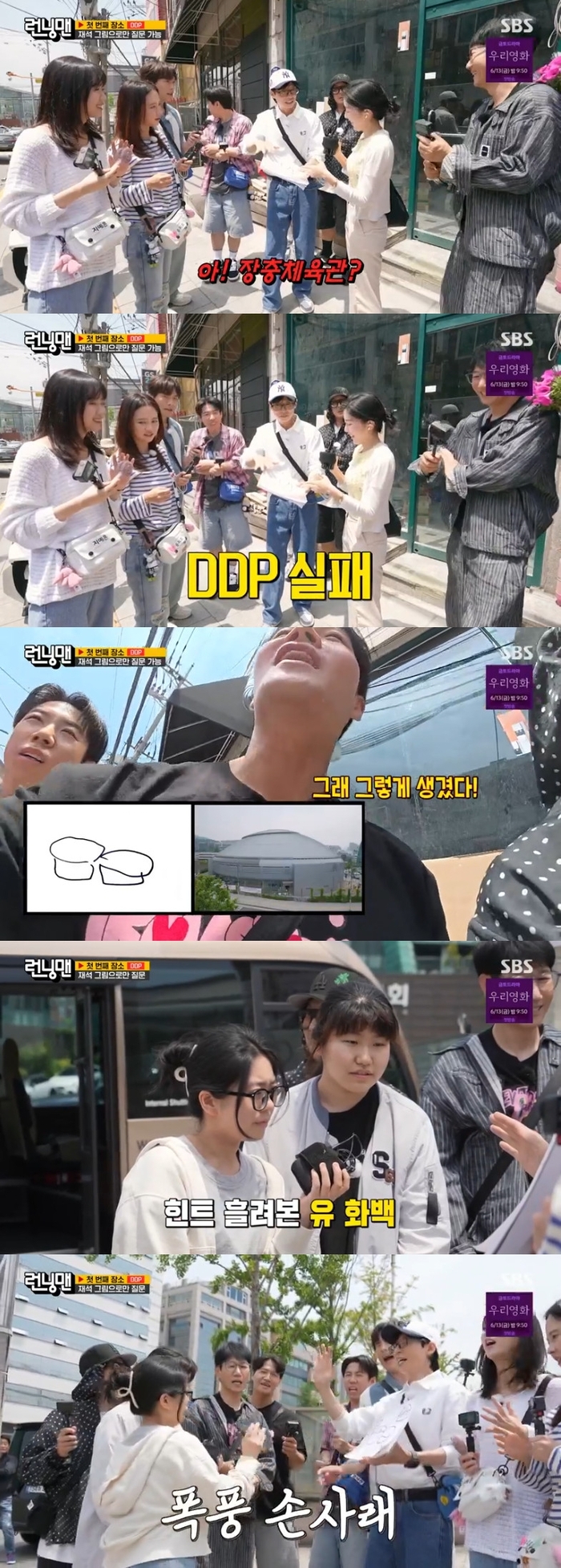 ‘런닝맨’.사진ㅣSBS‘런닝맨’멤버들이시민들대답에따라이동하는하루를그렸다.8일오후방송된SBS예능프로그램‘런닝맨’은‘드리는대로드림’편으로꾸며졌다.이날방송에는유재석혼자덩그러니오프닝장소에서있었다.제작진의말에5초만에그림을그린그는이상한촛불같은그림을그렸다.제작진은“멤버들은각자다른곳에있는데유재석씨그림을보고전원30분안에모여야오프닝이시작되고레이스의유리한혜택이제공됩니다.10분이지나면추가그리기기회를제공합니다”라며히든룰을설명했다.그림을전달받은하하는“드림이한살때도이렇게는...이게뭐야?이형도몇초안에그림그리라고했나?”라며어이없어했다.멤버들이계속해서맞히지못하자유재석은나머지그림을그리며“이정도면알아야지.봉은사잖아”라며확신했다.이때하하가인터넷검색으로봉은사인것을확인했고김종국,양세찬에게전화해“난도산공원에못갈것같아”라며혼자유재석에게향했다.뒤늦게멤버들전원이모이자제작진은“오후4시까지나들이장소세군데를즐겨야하는데실패하면자이로스윙벌칙을받습니다.재석이나들이장소를그려서시민에게물어본후답변받은장소만가야합니다”라고설명했다.미션장소로가던중유재석이양세찬에게미국다녀왔냐고묻자김종국은“난알고있었거든?그런데이상하잖아.보통말을하잖아”라며이상한낌새를눈치챘다.이에하하는“축하한다.애인이랑같이있으면좀그렇지?종국이형도아기때문에LA가는거지”라며놀리자양세찬은“아니야.재준이형이랑세형이형이랑셋이갔어”라고해명했다.하하는“아이돌이야?내동생아이돌사귄다!”라며거짓뉴스를만들었다.‘런닝맨’.사진ㅣSBS한남동에도착한멤버들은시민들을상대로DDP그림을맞춰보라고했지만오답인‘장충체육관’을듣고결국장충체육관으로향했다.멤버들이좀처럼정답장소로향하지못하자제작진은릴레이제기차기로총합50개를채우면10초추가시간을준다고제안했다.김종국혼자제기차기16개를채워미션에성공.멤버들은그림에격자무늬를채워넣기로했다.그러나시민의대답은‘불판’.또한번미션성공에서멀어진멤버들은DDP근처먹자골목으로향했다.하하는“재석이형이하면안돼.너무착하게해”라며입모양으로‘디디피’를읊어폭주하는모습을보였다.DDP바로옆으로움직인멤버들은시민에게그림을물어DDP루프탑으로향하게됐다.멤버들은“DDP에서는루프탑투어를할수있습니다.복불복4인만지붕을걷고나머지는평범한나들이를하면됩니다”라는제작진의말을듣고복불복4인으로지석진,유재석,양세찬,지예은을뽑았다.장비까지차고루프탑으로올라간유재석은“아여기가찌릿찌릿하다”라며겁을먹었지만“여기뷰봐봐”라며만족하는모습을보였다.이후멤버들은점심을걸고‘반대로쓰기’미션을하게됐다.첫번째문제의정답은‘광개토대왕’.그러나김종국은‘토’의‘ㅌ’을반대로써원성을받았다.‘대’를맡은지예은마저‘개’를적어결국오답이확정됐다.양세찬이“종국이형잘쓴다며?”라고나무라자김종국은“내가3번을꼬았네!정답의반대로쓰자했더니이렇게썼네?아니...이상하네?”라며민망함을감추지못했다.지예은역시멤버들이“근데왜‘개’썼어?”라고화를내자“아니저진심알고있었어요.‘대’예요.아잘못했어요!”라고역정을내웃음을자아냈다.시민이유재석의그림인‘물회’를맞추면서멤버들은물회,칼국수,김밥등배터지는식사하게됐다.이때지예은이볼빵빵먹방을펼치자김종국은“쟨마술사야”라며흐뭇해했다.이를보던유재석이“국종이가예은이를너무귀여워해”라고하자김종국은“아니귀엽잖아!”라며미소를지었다.이에송지효는“15년가까이날그렇게한번쳐다봐라!난웬수같이쳐다보면서!그래다르다달라!”라며하소연했다.유재석은“인제와서그렇게쳐다봐도이상하지”라며둘의러브라인을차단했다.세번째미션장소는남산팔각정.멤버들은남산7년차직원에게그림을묻고‘남산팔각정’이라는답을얻었다.멤버들은미션종료4분만을남긴채팔각정에서사진을찍어전원퇴근에성공했다.일요일오후6시15분SBS에서방송된다.[서예지스타투데이객원기자]Copyright©스타투데이.무단전재,재배포및AI학습이용금지