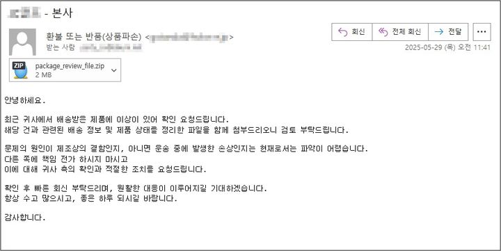 EXE파일을문서처럼위장해사용자실행유도…다단계압축으로탐지회피브라우저·암호화폐지갑·FTP정보까지탈취…텔레그램통해명령수신피싱메일(사진=이스트시큐리티제공)*재판매및DB금지[서울=뉴시스]송혜리기자=#최근귀사에서배송받은제품에이상이있어확인요청드립니다.해당건과관련된배성정보및제품상태를정리한파일을함께첨부드리오니검토부탁드립니다.이에대해귀사측의적절한조치를요청드립니다.최근이처럼온라인쇼핑몰판매업체를대상으로'상품파손에따른반품요청'내용을담은이메일이유포되고있다.하지만이는실제반품요청이아닌악성코드를퍼뜨리기위한피싱메일로확인돼주의가요구된다.이스트시큐리티에따르면이번에확인된피싱메일은'환불또는반품(상품파손)'이라는제목으로위장했다.메일본문에는"상세내용을첨부했으니확인해달라"는문구와함께압축파일이첨부돼있으며수신자가이를열람하도록유도하는방식이다.메일에포함된압축파일(ZIP)을열면또다른압축파일과실행파일(EXE)이여러단계로들어있는구조다.이는보안프로그램의탐지를피하려는의도로보인다.문제의실행파일이름은'배송당시상세사진및포장내외부배송정보포함기타사진들.exe'로설정돼있으며문서파일아이콘으로위장했다.수신자가이를문서로착각해실행할경우악성행위가본격적으로시작된다.최종적으로실행되는악성페이로드는정보탈취형악성코드비다(Vidar)다.이악성코드는감염된컴퓨터에서사용자의웹브라우저기록,암호화폐지갑정보,FTP(FileTransferProtocol)접속정보등다양한개인정보와로그인정보를몰래수집한다.또텔레그램채널이나스팀커뮤니티에등록된해커의서버와연결해추가명령을받거나,다른악성파일을다운로드해실행할수도있어각별한주의가필요하다.비다는현재서비스형악성코드(MaaS)형태로운영되며다양한사이버범죄자들이손쉽게이용할수있는것으로알려졌다.이스트시큐리티관계자는"출처가불분명한이메일의첨부파일은절대실행하지말고,특히EXE형식의실행파일여부를사전에반드시확인해야한다"고강조했다.☞공감언론뉴시스[email protected]©뉴시스.무단전재및재배포금지.