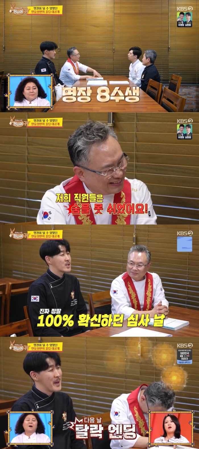 ‘사당귀’.사진lKBS안유성셰프가8수만에명장을획득했다고밝혔다.1일오후방송된KBS2예능프로그램‘사장님귀는당나귀귀’(이하‘사당귀’)에는안유성셰프와명장에도전하는그의제자가모습을보였다.이날방송에서안유성은“난정말7전8기!8번도전해서딴거야.명장심사는서류,현장심사,면접을통해봅니다.명장을따기위해학원도다녔어요.목소리톤보정,사투리교정,의사전달을정확하게하기위해서요”라고말해패널을놀라게하기도했다.안유성직원은“떨어지는날저희직원들을숨을못쉬었어요.정말100%확신해서안창살회식을잡았어요.축하한다고손뼉치고회식까지했는데떨어져서일주일동안저희가말을못붙였습니다”라며아찔한과거를회상했다.‘사당귀’는매주일요일오후4시45분KBS2에서만날수있다.[서예지스타투데이객원기자]Copyright©스타투데이.무단전재,재배포및AI학습이용금지
