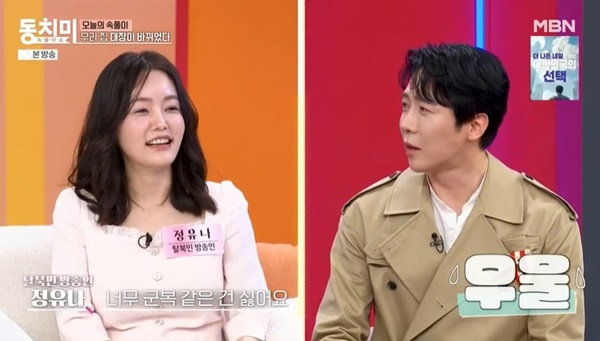 MBN‘속풀이쇼동치미’캡처MBN‘속풀이쇼동치미’캡처[뉴스엔유경상기자]정유나가에녹과핑크빛분위기에선을그었다.5월31일방송된MBN‘속풀이쇼동치미’에서는탈북민방송인정유나가출연해결혼고민을말했다.탈북민방송인정유나는탈북후에세계적인투자자짐로저스의수행비서로일하며이름을알렸다.그런정유나의고민은결혼으로“제가한국에와서열심히일만하느라아직결혼을못했다.여러가지이유가있어서결혼을못했겠지만‘동치미’에나오면좋은남편감을(찾을수있지않을까)”라고말했다.이에김현숙은‘동치미’에나오면결혼을더못하게된다고너스레를떨었고김용만은“이런복장어떠냐”며에녹과정유나를연결해주려했다.하지만정유나는마치군복을연상시키는에녹의의상을꼬집으며“너무군복같은건싫다”고거절했다.에녹은“단칼에차였다”고농담했다.(사진=MBN‘속풀이쇼동치미’캡처)뉴스엔유경상yooks@기사제보및보도자료[email protected]ⓒ뉴스엔.무단전재&재배포금지Copyright©뉴스엔.무단전재및재배포금지.