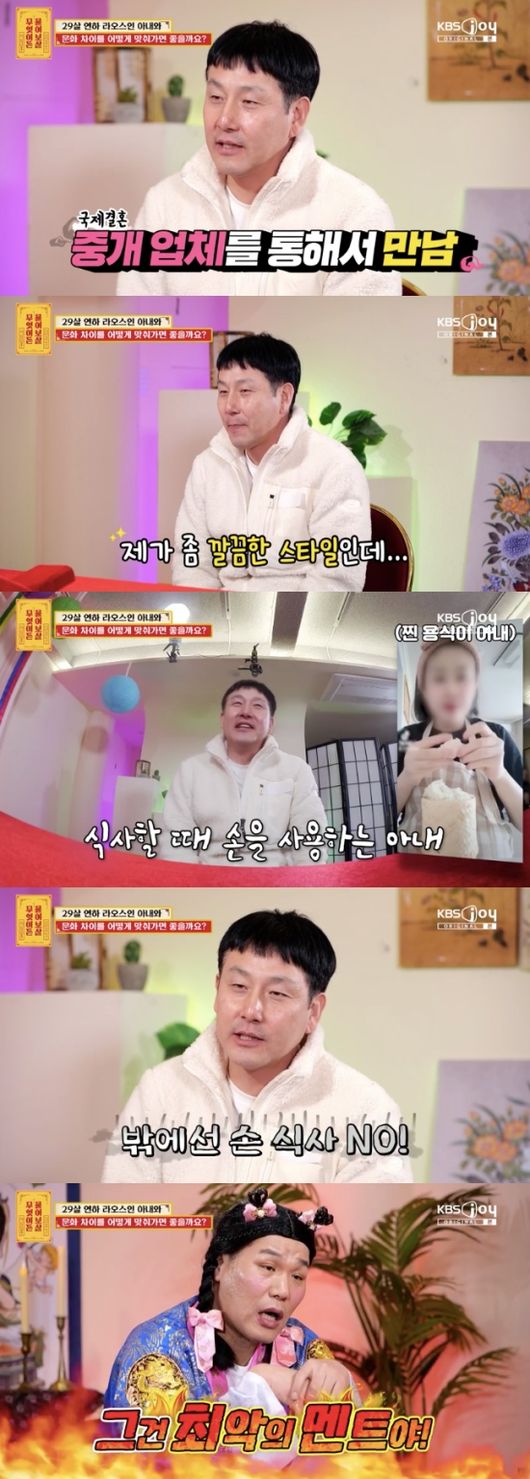 [OSEN=임혜영기자]29살연하의아내에게불만을가지는사연자에게이수근,서장훈이쓴소리를했다.26일방송된KBSJoy‘무엇이든물어보살’(이하물어보살)318회에는29살연하의라오스인과결혼한사연자가등장했다.사연자는아내와문화차이가심해고민이라고말했고이수근은“나이차이”가문제가아니냐고너스레를떨었다.사연자는“위생적인게차이가난다.꼭밥을손으로먹는다.휴대폰으로게임하다가손으로밥을먹는다.밖에서도그런다.그걸로엄청싸웠다.집에서만하는걸로합의를봤다”라고설명했다.또“너무위생개념이(없다).샤워를3분이상을안한다”라고덧붙였다.이에서장훈은“라오스에서물이부족했을수도있다.아내집에가보니어떠냐.강에서미역감는게더익숙할것같다.문화의문제라고생각하는게맞다.사연자가많이이해를해줘야한다”라고말했다.사연자는아내와많이싸운다며“임신하면서엽산을처음알게됐다.제일좋은걸로사서줬는데약을안먹는다.쓰레기통에다버렸다.나중에화가나서.‘다시라오스로가’라고하기도했다”라고말했다.서장훈은“최악의멘트다.대학교3학년정도의나이다.22살이마음대로안할것이다.라오스MZ가느닷없이한국에와서아저씨랑산다.하나부터열까지애지중지,설득하고알려줘야잘살수있다”라고조언했다.또“2세를임신하고있지않냐.귀한사람이니귀하게대접해줘라”라고직언했다./[email protected][사진]KBSJoy‘무엇이든물어보살’318회Copyright©OSEN.무단전재및재배포금지.