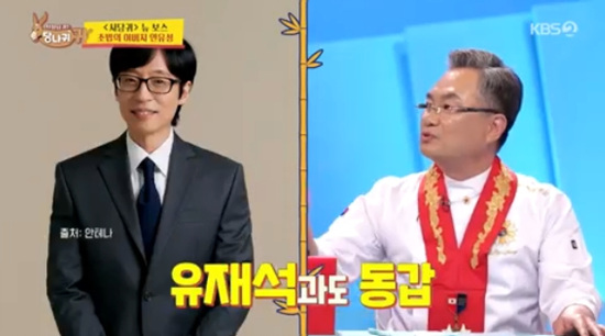 (엑스포츠뉴스원민순기자)'일식명장'안유성이유재석과동갑내기로박명수보다어리다고밝혔다.25일방송된KBS2TV'사장님귀는당나귀귀'에서는안유성이유재석과동갑내기라고밝히는모습이전파를탔다.이날안유성은현역으로일하는일식명장으로는자신이유일하다고말했다.안유성은MC들이"명장은누가인정해주는거냐"고궁금해하자"대통령으로나라에서지정한다.5년동안안나올때도있다.40년간17명뿐이다"라고설명했다.안유성은17명의명장중에서는막내명장이라고얘기했다.전현무는최현석,정호영등그동안나온셰프보스들이쟁쟁하다고했다.안유성은"정호영셰프는일단자격증도없는상태고정지선셰프는제가방송에서키운셰프다.최현석은키만커서소금만뿌린다"고디스를했다.안유성은특히최현석에대해"72년생이라고해서너무놀랐다.저하고같은72년생이다"라고말했다.유재석과동갑내기라고.안유성은박명수를향해형님이라고부르며"명수형님보다어리다"고했다.사진=KBS방송화면원민순기자[email protected]©엑스포츠뉴스.무단전재및재배포금지.