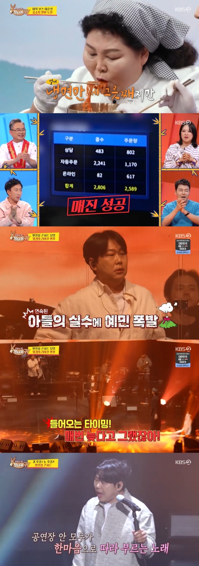 ‘사당귀’.사진lKBS안유성이새로운보스로‘사당귀’에출격했다.25일오후방송된KBS2예능프로그램‘사장님귀는당나귀귀’(이하‘사당귀’)에는이순실,변진섭,안유성보스가차례대로모습을보였다.이날방송에는이순실이첫번째보스로등장했다.지난번방송에서홈쇼핑완판을위해염경환을찾은이순실은홈쇼핑노하우를들었다.이후전철우셰프와조우,맛있게먹는연습을했다.그러나방송용옷에음식을잔뜩묻혀곤욕을치르기도.쇼호스트는“볶은메밀가루를넣었다는걸강조하셔야해요.그리고육수가굉장히시원해요.평양식육수에동치미를더해서감칠맛이난다고해야해요”라며이순실에게방송전필요한말을일러뒀다.순실은리허설내내방금들었던조언을기억하지못했고“못하면어떡하지?안되면어떡하지?라는생각이계속들었어요”라며걱정했다.제한시간40분이내에2천5개의냉면을판매하는것을목표로,생방송이시작됐다.PD가“면보여주세요”라고감독,이순실은“여기엔볶은메밀가루가들어갔어요!한국식으로맛있게만들었어요”라며연습했던대사를기억해내패널의박수를받았다.주문이오르고있는가운데이순실은“엄마한테많이혼났어요.식량을훔쳐가서쥐새X라고!역시훔쳐먹는게맛있더라고요~이건평양사람들만하는짓이에요”라며비속어를써보는이의마음을조마조마하게했다.결국오르던판매량이급하락했고PD는“비빔냉면으로가자”라며대책을냈다.이순실이비빔냉면을먹자주문량이1천3백개를돌파,생방송종료1분전매진에성공했다.두번째보스로는발라드의황제변진섭이모습을보였다.부산콘서트당일,변진섭은“왜안나와”라며아들을기다렸다.아들이뒤늦게나오자“꼼지락거리지마.무조건30분먼저가있는다고생각해야해”라며화를냈다.이어인상을팍쓰더니“너도그렇고매니저도그렇고왜이렇게늦어.야!넌지하20층에서올라오니?에어컨을켜놓으면나한테도움이되겠니?얘왜이러지진짜?공연당일은주변사람들이다신경써줘야해”라며매니저에게도쓴소리했다.그러나변진섭은팬을보고익살스러운표정을지었고각종애교를부리며대화했다.리허설중변진섭은다시고길동모드로변신해“잠깐스탑!감독님LED올라가는타이밍이늦어!”라며예민한모습을보였다.이후에도“다시!합주할때어떻게하기로했어?다같이하기로했는데지금안됐잖아.진짜미워죽겠네”라며밴드에게눈치를줬다.변진섭은“입체감이있어야관객들이감동해요.내가오늘뭔가느꼈고그래야해요”라며본인만의철학을말했다.이어안무를담당한아들이늦게무대에들어오고안무를실수하자변진섭은“들어오는타이밍이매번늦다고했잖아.저번에도얘기했었잖아”라며지적했다.결국변진섭은굳은표정으로무대에올랐다.다행히예민한모습은온데간데없이변진섭은“행복한시간을여러분과만들어가겠습니다”라며둘리표정을지었다.이어“추억이있으면맘껏꺼내십쇼!준비됐어요?”라며열창했다.‘사당귀’.사진lKBS세번째보스로는대한민국16대조리명장안유성이처음으로모습을보였다.안유성은본인을인자하고감싸줄수있는따뜻한아버지같다고소개했지만직원들은“좀주책바가지세요”,“감투욕심이엄청난욕망덩어리예요”,“명장부심이엄청나세요.불편하죠”,“참았다가폭발하는활화산같은보스죠”라며디스했다.VCR을보던안유성은“저런네가지없는!내가그렇게잘해줬는데”라며분노했다.영업준비를하던중안유성은“회한점이16g,밥이14g이야.둘이합쳐서30g이나오는지한번보자”라며직원을감시했다.그러나직원이26g짜리초밥을만들자“몇년을했는데도감각이없다는거지.그리고매일지각하잖아.뒤주방친구들은30분전에와서준비하는데!내가누구냐?명장이지?너희가명장가게를먹칠할수있어.예약할때너희이름으로예약할수있어?내이름보고예약하지”라며잔소리했다.이어안유성은직접30g,28g초밥을만들어패널을감탄하게했다.영업전안유성은주메뉴를직접맛보고피드백했다.그는서빙하던직원에게“성게향이너무강해.민감하신분들에는상했다는말이나올수도있어.내말이말같지않냐?”라며어두운분위기를만들었다.이때식당이오픈,손님이매장을가득채웠다.고객들이“향이미쳤네”라고감탄하자안유성은“명장의초밥맛이어때요?실장것보다더맛있죠?”라며끊임없이자기어필했다.실장은속마음인터뷰에서“카운터손님중에저를보고오시는분들도간혹계시거든요?명장님이그럴때마다질투하는것같아요”라고밝혔다.안유성은솔직히질투나냐는질문에“나중에본인가게차려서손님다데려가면난뭐먹고살아”라고솔직히답했다.이때안유성이없는사이실장이본인명함을가져와손님에게나눠줬고이를보던안유성은“웃기고자빠졌네!약간불안해요”라며거침없는입담을선보였다.장사가끝난후안유성은직원들에게1천만원상당의생참치를챙겨줘훈훈함을자아냈다.‘사당귀’는매주일요일오후4시45분KBS2에서만날수있다.[서예지스타투데이객원기자]Copyright©스타투데이.무단전재,재배포및AI학습이용금지