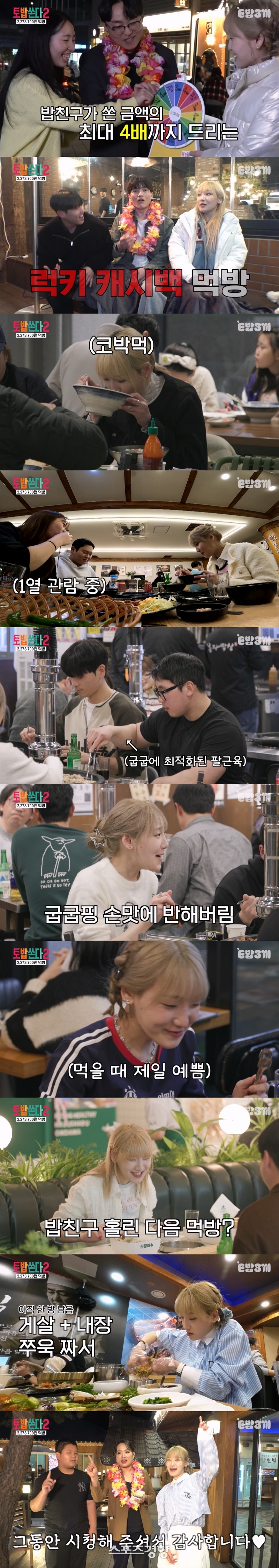 E채널유튜브‘이밥세끼’채널의히밥이‘토요일은밥이쏜다’시즌2를성공적으로마무리했다.거리에서시민들에게밥을얻어먹는도전으로누적조회수100만뷰를넘어서며주목받았다.24일공개된‘토요일은밥이쏜다시즌2’결산편에서는히밥이시즌2동안총227만3700원어치의먹방을선보인것으로공개됐다.시즌시작작인‘우대갈비’편부터52만1000원어치를기록한히밥은쌀국수,치킨,무한리필샤부샤부등다양한메뉴에서상당한식비를기록했다.24일공개된‘토밥’시즌2결산편.E채널제공가장높은식비를기록한메뉴는넷플릭스요리예능‘흑백요리사’에서인연을맺은‘딤섬여왕’정지선셰프와함께한6편의‘양념게장’이었다.정지선셰프와그의어린아들이함께한이에피소드에서히밥이먹은게장만73만8000원어치로집계돼놀라움을자아냈다.마지막‘스페셜’편에서는1편부터7편까지입증된히밥의‘무한대먹방력’이재조명되며시청자들의관심을끌었다.티캐스트E채널의맛집예능‘토요일은밥이좋아’스핀오프로시작한‘토요일은밥이쏜다’는작년시즌1을성공적으로마친바있다.올해4월시작한시즌2는6편게장편이단독조회수53만뷰를기록했고,7편샤부샤부편도유튜브‘인기급상승동영상’리스트에올랐다.프로그램은먹방유튜버히밥이길에서만난시민들에게“밥을사달라”고요청하며‘밥친구’를구하는미션을수행하는형식이다.히밥에게밥을사준‘밥친구’에게는원금회수는물론3~4배의‘럭키캐시백’까지가능한룰렛기회가주어진다.‘토요일은밥이쏜다’시즌2는24일토요일공개된스페셜편을마지막으로시즌을종료했다.이선명기자[email protected]©스포츠경향.무단전재및재배포금지.