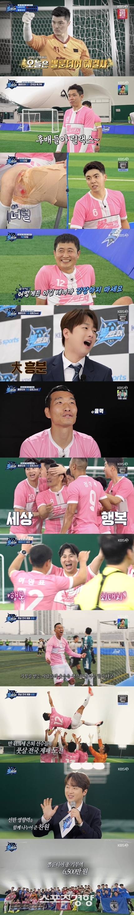 지난24일방송된‘뽈룬티어’방송화면.KBS2방송화면‘뽈룬티어’가풋살전국제패에성공하며6개월간의대장정을마무리했다.이찬원의개인기부금1000만원을포함해‘뽈룬티어’의총기부액은6500만원을달성했다.24일방송된KBS2예능프로그램‘뽈룬티어’에서는풋살전국제패의마지막이야기가펼쳐졌다.풋살룰도제대로모르던평균나이41.4세의은퇴한축구레전드‘뽈룬티어’는불과6개월만에전국을제패하며새로운역사를이뤘다.이들과함께했던이찬원은사비1000만원을기부금으로내놓았다.‘뽈룬티어’는이번경기승리로얻은상금800만원,이찬원의1000만원을더해1800만원을결식우려아동을위해기부했다.이로써‘뽈룬티어’의누적기부액은총6500만원을달성했다.프로선수4명이포진한유소년지도자군단라이프에프시는최강피지컬을무기로‘뽈룬티어’를압박했다.그러나김영광이‘뽈룬티어’첫골을터트린데이어,승부차기에서도선방으로역전승을이끌었다.이찬원은“김영광으로시작해서김영광으로끝난경기”라고평했다.건국대축구부와의경기는96학번이영표와98학번현영민과24학번직속선후배들의자존심맞대결로치러졌다.건국대축구부는풋살에익숙하지않을거라는예상과달리본인들의스타일로완벽하게소화하며‘뽈룬티어’를제압했다.2승2패로벼랑끝에몰린상황에서‘뽈룬티어’는전국제패의성패,리벤지,기부금까지모든것을걸고마지막경기에나섰다.상대는지난해‘뽈룬티어’에게대패의굴욕을선사했던김포제스트였다.운명처럼다시만난두팀사이에공방전이이어졌고,경기막판체력적한계가찾아왔다.그순간이영표는“우리에게는위기의순간에이기는법위닝멘털리티가있다”며승리를확신했다.그리고잠시후,백지훈의패스를받은조원희가결승골을터트렸다.발목뼈에금이간상태에서출전해부상투혼을펼쳤던조원희는“혹시나때문에팀이질까봐더욱정신차려서끝까지쥐어짰던경기였다”며소감을전했다.이영표는“시간이지났고은퇴를했지만축구화를신고공을찰때그마음과태도는하나도변하지않았다”며전국제패소감을밝혔다.정대세는“저는진짜이기적인선수였다.경기를이겨도제가골을넣지못하면행복하지않았다.그런데‘뽈룬티어’를하면서기부를받는사람들의웃음을생각하면힘이나고,힘들때한발짝더앞으로갈수있었다”고했다.이선명기자[email protected]©스포츠경향.무단전재및재배포금지.