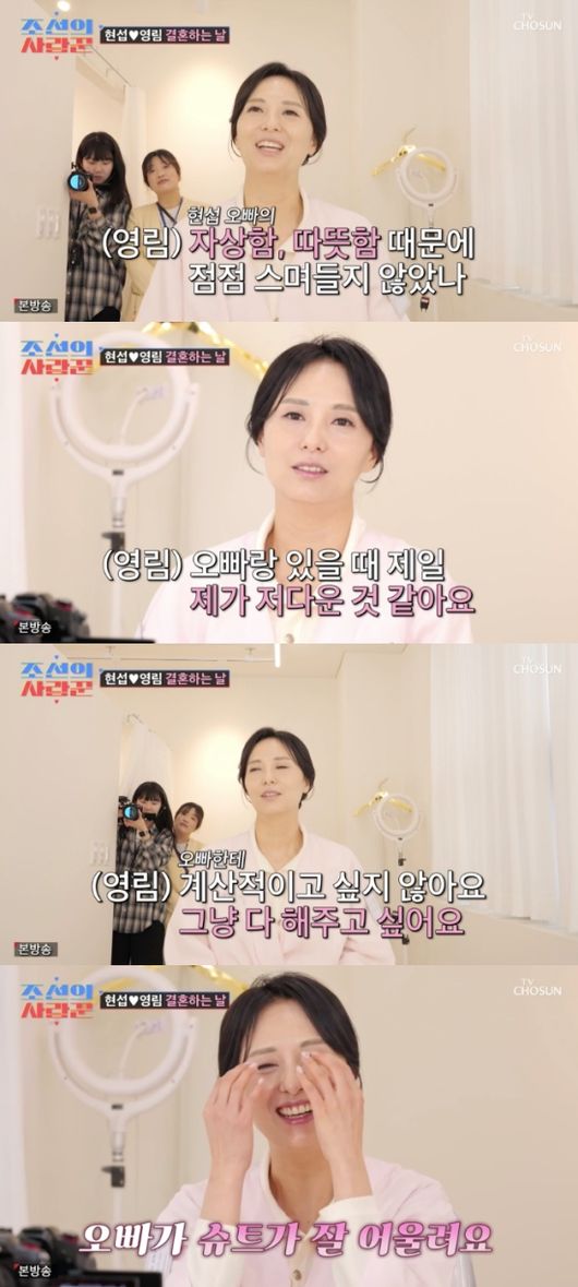 [OSEN=임혜영기자]정영림이심현섭을향한무한한사랑을드러냈다.19일방송된TVCHOSUN예능‘조선의사랑꾼’에서는하객1400명의역대급규모를자랑하는심현섭의결혼식현장이최초로공개되었다.김지민은심현섭의결혼식에대해“현섭선배님결혼은우리가똥기저귀갈고업어키우고(그런느낌이다)”라고말하며설레는마음을드러냈다.심현섭은그동안‘조선의사랑꾼’을통해소개팅을하는모습을공개해왔다.103번째소개팅에드디어정영림을만나게되었고박력있게고백,연애를시작하게되었다.그러나행복도잠시,심현섭은정영림과이별,재회를겪게되었다.우여곡절끝결혼까지하게된두사람.최성국은“주변에서대본이냐고한다.그래서‘누가대본때문에결혼하냐’한다”라며그만큼믿기지않는결혼소식이라고설명했다정영림은심현섭과결혼을결심하게된계기에대해“자연스럽게결심하게된것같다.되돌아가면서생각해보니까.오빠의자상함,따뜻함때문에점점스며들지않았나.오빠는항상저를웃게해준다.오빠랑있을때제일제가저다운것같다.보이는모습으로만보면결혼을안하려고할것이다.(혼수도내가다했다)계산적이지않고그냥다해주고싶다”라며깊은애정을드러냈다.드디어두사람의결혼식이시작되었다.심현섭은떨리는마음으로식장으로들어갔고두사람의결혼에많은이들의축하가쏟아졌다.청송심씨23대손심형래의축사가시작되었다.김국진은“평범한말을하지는않을텐데”라며걱정스러운마음을드러냈다.심형래는“길게말할필요없이엄영수형을봐라.나쁘다는게아니지만.50살넘어결혼하는데재혼하지말고오래오래행복하게아주잘살았으면좋겠다”라고말해결혼식장을뒤집어놓았다./[email protected][사진]TVCHOSUN예능‘조선의사랑꾼’Copyright©OSEN.무단전재및재배포금지.