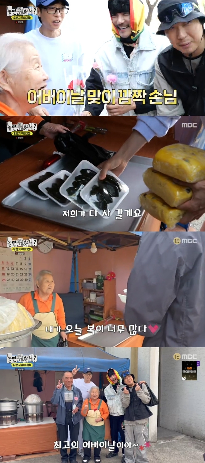 ‘놀면뭐하니’.사진IMBC유재석이술빵촬영중선행을베풀었다.17일오후방송된MBC예능프로그램‘놀면뭐하니?’(연출김진용장우성장효종왕종석,작가최혜정)에는술빵집을발견한유재석이모습을보였다.이날방송에서유재석은“아까술빵집봤는데할머니가아직개시를못하신것같아”라며하하,주우재,KCM과함께술빵집으로향했다.멤버들을발견한할머니는“아이구오늘영광이야!여기도왔네?”라며환하게웃었다.유재석은“아직개시못하셨죠?술빵이랑쑥떡발견했는데너무맛있어보여서요”라며인사했다.이어유재석이“우리얼마있는데?5만원?그럼5만원어치사자.저희가다사갈게요”라며음식을전부구매하자할머니는“내가오늘복이너무많다.오늘최고의어버이날이야”라며고마워했다.MBC‘놀면뭐하니?’는매주토요일오후6시30분방송된다.[서예지스타투데이객원기자]Copyright©스타투데이.무단전재,재배포및AI학습이용금지