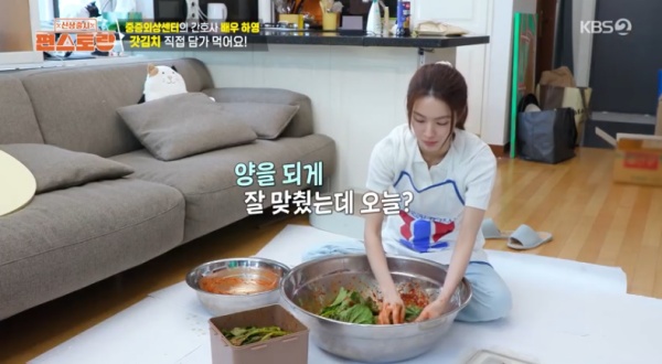 편스토랑/사진=KBS2캡처[스포츠투데이정예원기자]'편스토랑'하영이'셀프김장'에돌입했다.16일방송된KBS2예능'신상출시편스토랑'(이하'편스토랑')에는넷플릭스시리즈'중증외상센터'에서열연한배우하영이출연했다.편스토랑/사진=KBS2캡처이날'라면애호가'하영은라면과함께먹을갓김치를집에서직접담그기시작했다.그는다진생강,다진마늘,소금,고춧가루,사과를이용해양념장을만들고자했다.그런데이사를한지얼마되지않아믹서기가보이지않았다.그러자하영은사과대신냉장고에있던사과주스를넣었다.그는"이전에사과주스로김치를담근적이있는데정말맛있더라"라고떠올렸다.이어하영은전자레인지를이용해풀을간단하게만들었다.그는"적은양의풀은냄비에끓이지않고전자레인지에돌리는것이더편하다"고설명했다.양념장을만든하영은"초미니하우스에어떻게공간을만드는지보여드리겠다"며집한가운데에있던탁자를치웠다.이같은방법으로침실,연기연습공간등이모두만들어진것이었다.또한미술전공자답게종이를바닥에깔고본격적으로갓에양념을버무렸다.하영은"이것도나름드로잉이다"며미술학도다운시선을언급했다.이내능숙한손놀림으로김치통에갓을담가김장을완료,"오늘양을정말잘맞췄다"며뿌듯함을드러냈다.[스포츠투데이정예원기자[email protected]]Copyright©스포츠투데이.무단전재및재배포금지.
