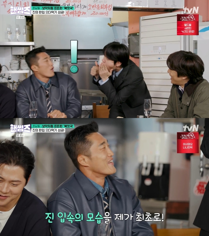 ‘핸썸가이즈’.사진ItvN‘핸썸가이즈’방송캡처종합격투기선수출신방송인김동현이그룹방탄소년단진의먹방에너스레를떨었다.15일방송된tvN‘핸썸가이즈’에서는진과함께직장인점저메추(점심저녁메뉴추천)를위한한남동맛집탐방에나선차태현,김동현,이이경,신승호,오상욱의모습이그려졌다.이날‘핸썸가이즈’멤버들과진은북엇국맛집을찾았다.이이경은북엇국을못먹는‘냉면팀’차태현,김동현,진에게게임을제안했다.세사람이숫자를최대3개씩말해31을말하는사람에게산더덕도야지를주겠다는것.그결과진이산더덕도야지를먹게됐다.산더덕도야지를크게한입먹은진은감탄을내뱉었다.이어김동현을툭툭쳐자신의입속을보여줬다.이에김동현은“진입속의모습을내가최초로봤다.치아가건강하다.잠깐사이에다섞였다”고너스레를떨었다.한편‘핸썸가이즈’는매주목요일오후8시40분방송된다.[이세빈스타투데이객원기자]Copyright©스타투데이.무단전재,재배포및AI학습이용금지