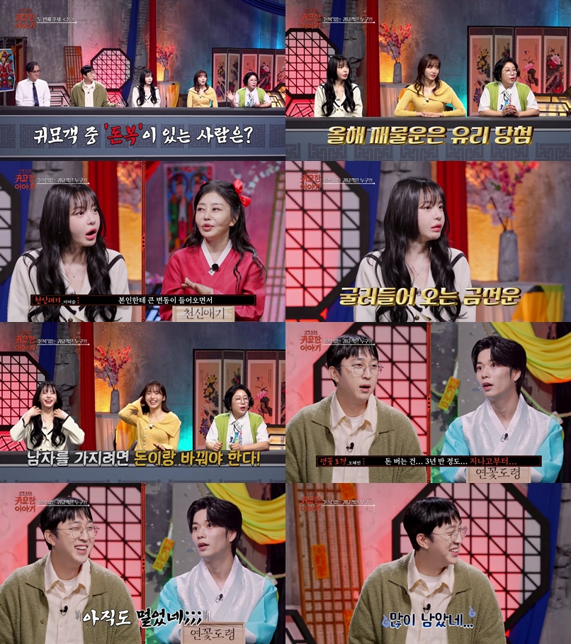 ▲귀묘한이야기.제공|SBSLife[스포티비뉴스=장진리기자]성우겸방송인서유리가재물운예언을듣는다.서유리는SBSLife‘신빨토크쇼-귀묘한이야기’(이하귀묘한이야기)의귀묘객으로등장한다.이날촬영은‘돈’을주제로진행되고,서유리는“나와슬리피가출연했다고(돈이)주제로나온거냐”라고너스레를떤다.이를듣던슬리피는“저는검색하면많이나온다”라고셀프디스하며“나는돈복이라는자체가없는것같다.그런데희한하게죽기직전에뭐하나들어온다.꿈에서피가나오면뭐가들어온다”고한다.김영희는무속인들에게“저희중에올해재물운이들어온사람이있냐”고묻고,천신애기는서유리를뽑으며“큰변동이들어오는데금전하고같이들어온다고한다.생각하지못한곳에서고정이되는등변동이크게되면서돈이같이들어온다”고의견을전한다.천신애기는이어서유리에게“단하나남자를가지려면돈하고바꿔야한다.쉽게말하면남자가들어오면돈이나간다.결론은남자복이없다”고덧붙여모두를놀라게한다.슬리피도무속인들에게“저도뭐라도하나말해달라”고요청하고,연꽃도령은“돈버는것은3년반정도지나고부터될것같다”고생각을전한다.원하는답을듣지못한슬리피는“3년동안또,많이남았네”고낙담한다.‘귀묘한이야기’는28일오후10시10분방송된다.<저작권자ⓒSPOTVNEWS.무단전재및재배포금지>Copyright©스포티비뉴스.무단전재및재배포금지.