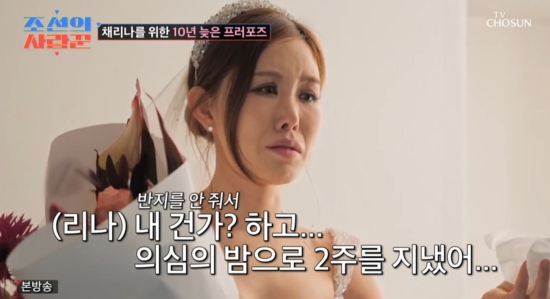 (엑스포츠뉴스이이진기자)전야구선수박용근이가수채리나에게결혼10년만에프러포즈했다.28일방송된TV조선'조선의사랑꾼'에서는박용근이채리나에게프러포즈한장면이전파를탔다.이날박용근은결혼10년만에결혼식을준비하는과정에서프러포즈를하기로결심했다.박용근은제작진에게도움을요청했고,웨딩드레스숍에가는날프러포즈를하기로했다.특히박용근은프러포즈당일김진과민경의도움을받았고,채리나에게지인들에게받은영상편지를보여줬다.백지영은"저는채리나의언니가수백지영이라고한다.우리리나는저한테는굉장히따뜻한마음이따뜻한동생인것같다.이런저런일이많이있었던질풍노도의시기에소중한추억으로자리잡고있는소중한동생이다"라며전했다.이상민은"우리리나는복덩어리다.우리룰라로서는굉장한복덩어리고착하고의리있고배려심도많고친근함이아주많은아이이다"라며칭찬했고,간미연은"따뜻한햇살같은존재?그래서같이있고싶고가까이있고싶은그런사람?"이라며털어놨다.아유미는"오래오래보고싶은사람.한문장으로표현하긴어렵긴한데때로는언니같고때로는친구같고때로는엄마같다.오늘정말특별한하루를보냈으면좋겠다.축하한다"라며밝혔다.나르샤는"채리나란오메가3,비타민ABC,아르기닌그리고정신적지주.저에게채리나는멀티비타민"이라며못박았고,김호영은"채리나누나는자존감을끌어올려주는사람이다.결혼너무너무축하하고우리매형하고행복을끌어올려서예쁘가살아라.사랑한다"라며축하했다.채리나시어머니는"우리리나는똑순이다.일도똑순이부모한테도똑순이형제들한테도똑순이너무너무똑순이처럼잘한다.항상저는고맙게생각한다.리나야너무너무고마워.형제잘챙기고시어머니잘챙기고하늘에서주는며느리는복이라고했는데너무너무고맙다.우리사랑하는작은아기사랑해"라며애정을과시했다.채리나어머니는"우리딸은너무착하고효녀고그리고우리리나10주년결혼축하한다.사랑해.용근이하고리나진짜사랑한다.건강하게잘지내라"라며감격했다.채리나는영상편지를보는내내눈물을흘렸다.더나아가박용근은직접채리나앞에서편지를읽었고,"안녕리나야?나에게리나란내인생의0순위야.그어떤것보다소중하고바꿀수없는0순위채리나.이렇게영상편지를준비한건당신이나뿐만아니라주위의많은사람들에게사랑받고있는귀중한사람이라는걸알려주고싶었어.당신이랑만나서연애하고결혼까지13년이란시간을함께보내고있네"라며회상했다.박용근은"처음만났을때부터정말많은우여곡절을보냈잖아.그래서제대로된프러포즈도못했던게마음에늘걸렸거든.이렇게라도결혼식을올리고당신과좋은시간을보낼수있음에너무감사해"라며고백했다.박용근은"최근시험관하면서많이힘들었지?더챙겨주지못해서미안하고쓰다보니온통미안함뿐이네.온갖약먹고배에멍자국이가득하고호르몬약때문에감정이불안해지고여러힘든일을혼자만겪게하는게너무너무미안하더라.나한테는앞으로생기는아기보다지금의당신채리나가너무중요하고더소중하니까언제든지당신이하고싶은대로하자.마지막으로정말진심으로말할게.리나야나와결혼해줘서감사하고진심으로사랑한다"라며고마움을드러냈다.그뿐만아니라김진과민경은채리나와함께눈물을터트렸고,채리나는"나사실이반지를창원갔을때몰래봤다.'내건가?'하고의심의밤을2주를지냈다"라며비하인드스토리를공개했다.사진=TV조선방송화면이이진기자[email protected]©엑스포츠뉴스.무단전재및재배포금지.