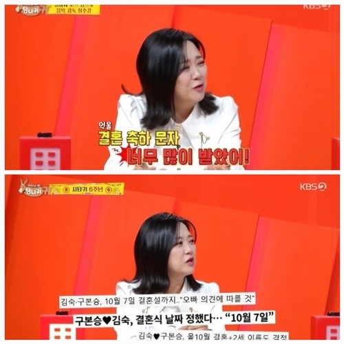 방송인김숙이결혼설로인해매니저까지혼란에빠진웃픈상황을전했다.27일방송된KBS2TV예능‘사장님귀는당나귀귀’에서는김숙이최근불거진결혼설을언급했다.김숙은“사당귀때문에결혼기사가났다”며“심지어매니저가‘10월7일스케줄비워야하냐’고물어봤다”고밝혀폭소를자아냈다.김숙은“나도모르는결혼날짜가정해져있더라”며어이없어했고,전현무는“그래도댓글반응은좋더라.다들응원해줬다”고위로했다.김숙은“축하문자만엄청받았다”며쓴웃음을지었다.방송인김숙이결혼설로인해매니저까지혼란에빠진웃픈상황을전했다.사진=사당귀앞서김숙은KBSJoy,KBS2‘오래된만남추구’에서구본승과최종커플이된뒤핑크빛분위기를이어오고있다.특히‘사당귀’촬영중박명수가“가을쯤결혼하냐”는질문에김숙이“오빠의견에따르겠다”고답하자,박명수가“그럼10월7일결혼하는걸로”라고농담한것이발단이됐다.한편김숙은여전히유쾌한매력으로시청자들에게웃음을선사하고있다.[김승혜MK스포츠기자][ⓒMK스포츠,무단전재및재배포금지]Copyright©MK스포츠.무단전재및재배포금지.