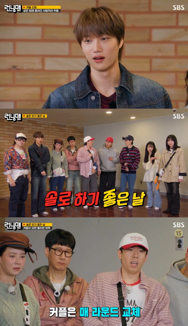 SBS런닝맨[티브이데일리황서연기자]그룹엑소카이가솔로컴백과함께'런닝맨'에출격했다가진짜솔로가됐다.27일저녁방송한SBS예능프로그램'런닝맨'에서는카이,배우김아영이게스트로출연한가운데커플레이스가이어졌다.이날9명의출연진은낌질방안에서각자방을골라커플을맺었다.한명은필연적으로솔로가돼야하는상황,이에멤버들은순서대로방을골라안으로들어가상대를기다렸다.특히먼저아이스방을선택해들어간지예은은오매불망카이를기다렸다.평소에도카이의팬이었던것.하지만지예은의방을찾은것은김아영이었다.지예은은"너뭐야.다시가"라고말하며안타까워했다."나진짜팬인데"라며카이와팀을이루지못한것을아쉬워했다.SBS런닝맨그러나김아영이방을찾아온이후카이도아이스방을찾아왔다.지예은은닫힌유리문너머로카이를보고비명을질렀지만,이미김아영과팀을이뤘기에커플이될수는없었다.카이는"아,나도들어가고싶은데"라고말하며발길을돌렸고,결국최종솔로가됐다.하지만반전이있었다.오늘의'런닝맨'레이스는솔로가유리한게임이었던것.제작진은"매라운드마다커플을다시선정하며,최종적으로커플이가장적게된사람이유리한게임"이라고설명했고김아영은카이에게"역시'될놈될'이라고말했다.카이는커플을이룬출연진이우스운커플룩으로갈아입고나오는사이에도멋진패션을유지하며혼자솔로로남아이목을끌었다.[티브이데일리황서연기자[email protected]/사진=SBS]런닝맨|지예은|카이[Copyrightⓒ*세계속에新한류를*연예전문온라인미디어티브이데일리(www.tvdaily.co.kr)/무단전재및재배포금지]Copyright©티브이데일리.무단전재및재배포금지.