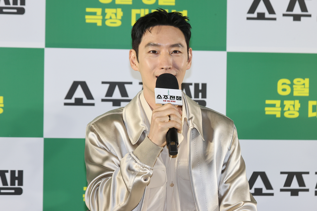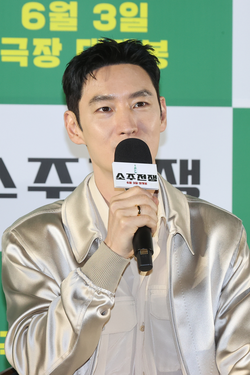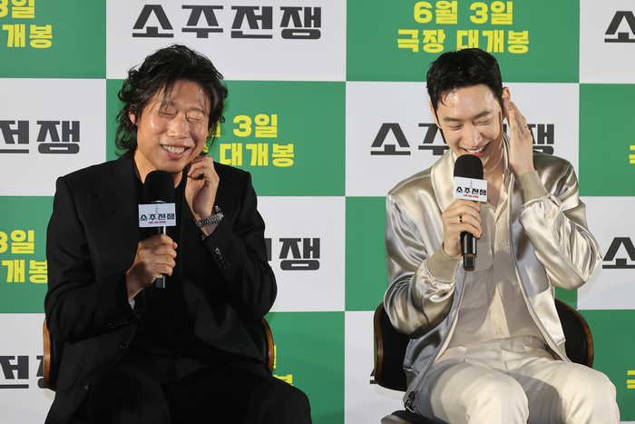 [OSEN=조은정기자]영화'소주전쟁'제작보고회가24일서울강님구메가박스코엑스에서열렸다.[OSEN=하수정기자]'연기장인'유해진,이제훈이처음뭉친'소주전쟁'이관객들과의만남을기다리고있다.24일오전서울메가박스코엑스에서는영화'소주전쟁'의제작보고회가진행됐다.이자리에는주연배우유해진,이제훈,손현주,최영준등이참석했다.'소주전쟁'(제공배급(주)쇼박스,제작더램프(주))은1997년IMF외환위기,소주회사가곧인생인재무이사종록(유해진분)과오로지수익만추구하는글로벌투자사직원인범(이제훈분)이대한민국국민소주의운명을걸고맞서는이야기를그린다.유해진은극중국보소주의부도를막기위해살신성인하는재무이사표종록으로분해열연했다.누구보다애사심깊은재무이사인동시에소탈한면모도지니고있다.그러나글로벌투자사직원인범을만나면서큰위기를겪는다.유해진은"술을소재로다룬영화라서시나리오도술술읽혔다"며"이제훈과브로맨스내용이있는데,극이진행되면서우정이생기는브로맨스가있다.완성된결과물에도그런게잘비춰졌을지궁금하다.워낙이제훈이연기를잘해줬다"고칭찬했다.영화에서음주연기를펼친유해진은"전개상소주신상품이나오는데콘셉트가'부드럽고후레쉬하게'라면서맛을강조한다.그렇게마시려고연기했다"며"난원래소주를좋아하는편이라서맛나게먹는게어렵지않았다.우리영화를보면서'소주한잔하고싶다'는생각을하면좋겠다"고밝혔다.이제훈역시음주연기를선보였는데"내가술을잘하지못해서소주는쓰고힘든그런이미지가있는데이번작품을통해서소주를'짠짠~'하는기분으로마시니까달게느껴지는기분이들었다"며"점점그게적응되면서소주를계속찾게됐다.'저소주진짜마셔보고싶다'는기분이관객분들에게전달된다면그것만큼기쁜순간은없을것"이라고말했다.[OSEN=조은정기자]영화'소주전쟁'제작보고회가24일서울강님구메가박스코엑스에서열렸다.이제훈은글로벌투자사의유능한직원최인범을맡았다.회사를향한종록의헌신적인태도는물론,퇴근후소주한잔을함께마시는회식자리도이해하지못하다가종록과지내면서변화를맞는다.이제훈은"유해진선배님이이작품을하신다고해서'이런기회가쉽지않다'고느꼈다.그리고모든배우분들이전부캐릭터와찰떡같이어울리더라.연기앙상블을비롯해환상적으로할수있겠다생각했다"며작품을선택한이유를공개했다.유해진은"이제훈을옆에서보면코가정말잘생겼다.어쩜이렇게높은지모르겠다"며외모를칭찬했고,최영준은"어린베테랑이다.작품전체를볼줄안다"며극찬했다.이에이제훈은"부끄럽다"며몸둘바를몰랐다.최근종영된드라마'협상의기술'과차이점을묻는질문에이제훈은"영화를보시면드라마캐릭터와전혀다르다는걸인지하실수있을거다.드라마는협상전문가로스페셜리스트로역량이높은인물인데,'소주전쟁'은자신의욕망과야욕을뿜어내는부분에있어서치기어린부분도있다.완성해가려는목표치가있어서감정같은것들이드러난다.'이친구는사람냄새나는부분이있구나'라고캐릭터차이에서느끼실수있을것같다.작품자체의온도도맥락적으로보면비슷할수있지만,전혀다른점이있어서그점을즐겨주시면좋겠다"고답했다.[OSEN=조은정기자]영화'소주전쟁'제작보고회가24일서울강님구메가박스코엑스에서열렸다.[OSEN=조은정기자]영화'소주전쟁'제작보고회가24일서울강님구메가박스코엑스에서열렸다.손현주는국보그룹을물려받은재벌2세석진우를,최영준은국보그룹의위기관리를맡은변호사구영모를각각연기했다.이날최영준은자신의캐릭터를소개했고,이때손현주는"(최영준씨가)작년에결혼해서지금신혼이다"라고알렸다.앞서최영준은지난해10월20일서울모처에서오래교제한비연예인신부와결혼식을올렸다.당시최영준의소속사에이스팩토리는"최영준배우가10월20일오랜연인과결호식을올린다.예식은서울모처에서비공개로진행될예정"이라며"최영준배우의결혼소식에따뜻한축하를보내주시면감사하겠다"며공식입장을밝히기도했다.손현준은"작년에결혼해서지금신혼이다",이제훈은"아직신혼여행을못갔다고하는데,조만간가신다고했다",유해진은"신혼여행을구라파그쪽으로간다고했다"며유럽신혼여행을언급해웃음을자아냈다.최영준은동료들의허니문스포에민망한듯크게웃었다.유해진은선배손현주에대해"내가정말존경하는몇안되는선배님이다.매체연기를보면서어떻게저런연기를할까싶었다"며"이제는요령을부리면서하라고했다.'형님나이가몇인데..'라고생각했다.근데내가듣기로는요령을안부리다가촬영하면서사고도많이난걸로한다.그정도로몸을사리지않는다.근데그덕분에내가예전에연기를봤을때'좋아하는연기였구나'이런생각을많이했다"며존경심을드러냈다.[OSEN=조은정기자]영화'소주전쟁'제작보고회가24일서울강님구메가박스코엑스에서열렸다.이날제작보고회에는이례적으로최윤진감독이불참했는데,현재제작사더램프와감독은내부갈등을겪고있다.당초'모럴해저드'라는제목으로촬영이마무리됐고,1차편집본까지나왔으나후반작업을진행하던2023년시나리오저작권분쟁에휩싸이며구설수가불거졌다.최윤진감독은지난해9월제작사로부터감독을해고