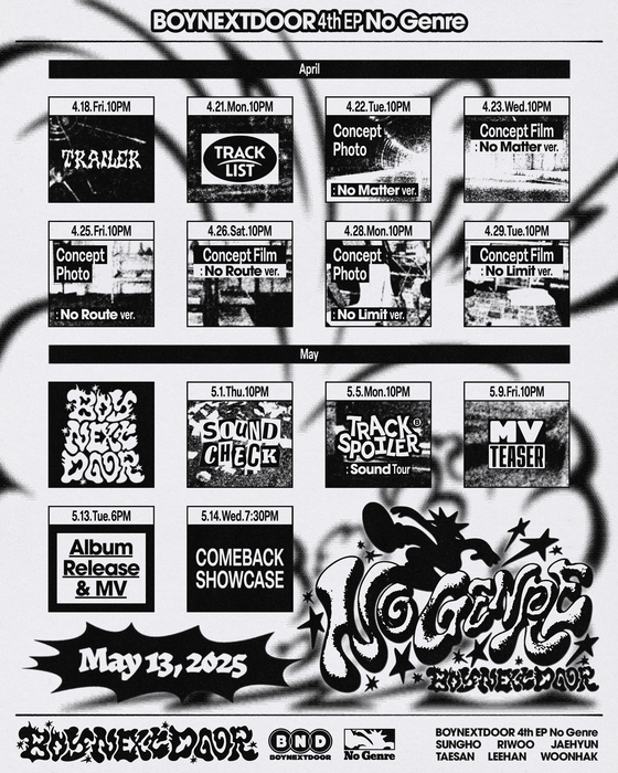 물오른보이넥스트도어(BOYNEXTDOOR)가5월13일컴백을앞두고프로모션일정을공개했다.보이넥스트도어(성호,리우,명재현,태산,이한,운학)는16일오후10시팀공식SNS에미니4집'노장르(NoGenre)'의스케줄러를게재했다.스케줄러는다양한정보를힙하고쿨한흑백디자인으로표현해눈길을사로잡는다.스케줄러에따르면보이넥스트도어는18일트레일러필름,21일트랙리스트를차례로공개한다.22일~29일에는'노매러(NoMatter)','노루트(NoRoute)','노리밋(NoLimit)'등총세가지버전의컨셉트필름과사진이준비돼있다.이어5월1일사운드체크,5일트랙스포일러,9일타이틀곡뮤직비디오티저로기대감을끌어올리고13일오후6시미니4집'노장르(NoGenre)'의전곡음원과타이틀곡뮤직비디오를공개한다.발매다음날인14일오후7시30분에는팬들과함께하는컴백쇼케이스를개최한다.'노장르(NoGenre)'는보이넥스트도어의당당한자신감이담긴앨범이다.이들은신보를통해'장르'라는테두리에자신들을가두지않고하고싶은음악을하겠다고말한다.상승가도를탄보이넥스트도어가이어갈한계없는도약이기대된다.보이넥스트도어는최근첫단독투어'보이넥스트도어투어'넉온Vol.1'(BOYNEXTDOORTOUR'KNOCKONVol.1')'을통해인천,도쿄,오사카,가나가와,싱가포르,타이베이,홍콩,자카르타등총12개도시에서17회공연을펼쳤다.오는6월에는도쿄무사시노의숲종합스포츠플라자메인아레나에서'보이넥스트도어투어'넉온Vol.1'앵콜인재팬(BOYNEXTDOORTOUR'KNOCKONVol.1'ENCOREINJAPAN)'을개최하고7월서울KSPODOME에서진행하는파이널공연을통해투어의마지막을화려하게장식한다.김선우엔터뉴스팀기자[email protected]사진=KOZ엔터테인먼트Copyright©JTBC.무단전재및재배포금지.