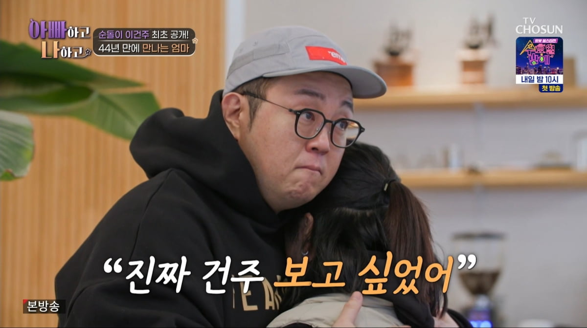 (엑스포츠뉴스우선미기자)순돌이이건주가자신을낳아준친모를44년만에마주했다.15일방송된TVCHOSUN'아빠하고나하고'(이하'아빠하고')에서는이건주가44년만에처음으로친어머니를마주했다.온국민의사랑을받는아역스타에서현재는무속인의삶을살고있는이건주는TV속화려한모습과달리2살때부모님과헤어져할머니와고모들의손에자랐다.이건주는가명만알고있어찾기어려웠던어머니에관해"정보가없어막막했다"라고전했다.이어이건주는가족관계증명서와주민등록초본을떼어보려주민센터로향했고,이를본여경래는"두근두근하다"라며심정을전했다.차례를기다리던이건주는"머릿속은복잡하고혼란스러웠다.'내가이렇게하는게맞을까?'긴장이많이됐다.두렵고떨렸다"라며긴장된속마음을내비쳤다.결국가족관계증명서를발급받은이건주는44년만에어머니의이름을확인했고,이에"오히려무덤덤했다.'존함이이거였구나'까지였다"라며덤덤한심정을전했다.하지만어머니의주민등록초본까지신청해이를확인한이건주는표정이굳었고,"갑자기머릿속이하얘졌다"라며말했다.왜그렇게당황했냐는제작진의질문에이건주는"제가무당이라서그런지는모르겠는데제가생각한주소가맞았다.(어머니가살고계신곳이)강원도였다.막연하게'강원도에계실것같은데?'라는생각이들었었다"라며전했다.하지만어머니의초본을확인해본이건주는재혼해동생들을낳고살고계신다는것을알게됐다.이에대해이건주는"밑에처음보는이름이있는데,저랑성도다르고누군지도모르는데같이올라가있어서혼란스러웠다"라며심정을전했다.며칠뒤이건주는"저의어머니를드디어만나뵈러가는길입니다"라고전하며44년만에어머니를만나러가는길을공개했다.이건주는내내"너무떨렸고,너무긴장됐다.운전하고가면서까지도고민을많이했다.무작정찾아가는게맞는건지"라며어머니의서류상주소지에도착했다.이어이건주는어머니의서류상주소지에도착했고,어머니는눈물을흘리며이건주를향해"건주야엄마야.진짜건주보고싶었어"라고말하며껴안았다.사진=TVCHOSUN우선미기자[email protected]©엑스포츠뉴스.무단전재및재배포금지.