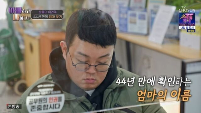 TV조선'아빠하고나하고'/TV조선'아빠하고나하고'방송캡처[마이데일리=강다윤기자]순돌이'이건주가44년만에친모의이름과성이다른두동생의존재를알게됐다.15일방송된종합편성채널TV조선'아빠하고나하고'에서는아역스타'순돌이'에서현재는무속인의삶을살고있는이건주가44년만에처음으로엄마를찾아나섰다.TV조선'아빠하고나하고'/TV조선'아빠하고나하고'방송캡처이날이건주는수심가득한얼굴로연이어한숨을내뱉더니어딘가로전화를걸었다.이건주가전화한상대는어머니,아버지대신그를키워준고모였다.놀랍게도이건주는"내가엄마에대해서한번찾아볼까하는데아무것도아는게없다"라고이야기했다.제작진과의인터뷰에서이건주는"우선내가요즘여러가지생각들이많았다.신아버지나주위에있는분들에게조언을구했다.그를토대로내마음이움직이는대로해보고싶었던것같다"며설명했다.그간'아빠하고나하고'를통해접한다른가족들의이야기덕에친모를찾을결심을했다는것.스튜디오에서이를지켜보던이건주는"이상하게'아빠하고나하고'를촬영하면할수록나도마음이편안해졌다.아마나혼자가아니라여경래셰프님도계시고많은분들이나오시지않나.막연하고단순하게'우리엄마는어떤사람일까'하고생각한것같다"며"생각도하고속으로는궁금한데그냥너무단순한문제였던것같다.그냥보고싶었던건가'하는생각이들었다.나에대해서생각을많이하게되더라"라고털어놨다.그러나아쉽게도이건주고모는친모의이름을처음부터가명으로알고있었다.이건주가가명이라도알려줄것을부탁하자고모는"가명으로어떻게찾겠냐.내가미리알았어야됐는데가명만알고있어서미안하다"며울음을터트렸다.고모의눈물에이건주는서둘러통화를마무리했다.이건주는친모의가명에대해"나도몰랐던이야기였다.통화끝나고고모가문자로보내주셨는데가명이아니라고향에서쓰는아명이라고하지않나.(엄마가)어릴때동네에서부르는이름같은게있었다.그런걸로알고계셨더라"라고설명했다.이름도모르는친모를찾으려이건주는답답한마음에포털사이트에'가족찾는법'을검색했다.그러나한참을검색하던중뜻밖의힌트를얻을수있었다.가족관계증명서를발급받으면발급자의부모,자녀,배우자인적사항과성명,주민등록번호,출생연월일,성별,본을알수있었던것.TV조선'아빠하고나하고'/TV조선'아빠하고나하고'방송캡처곧장주민센터를찾은이건주는가족관계증명서를발급받았다.가족관계서를통해44년만에친모의이름을확인했지만이건주는"정말오히려무덤덤했다.'존함이이거였구나'까지였던것같다딱"이라고심경을전했다.이어이건주는친모의주민등록초본발급도요청했다.부모와자식관의관계를증명할경우자녀는부모의주민등록초본을발급받을수있다.이건주역시"나도몰랐는데내가우리어머니랑가족이라는게증명이되면어머니의가족관계와주소가나와있는초본을떼어볼수가있더라.가족이라는게증명이되면"이라고설명했다.주민등록초본을받아본이건주는굳은표정을지으며쉽게눈을떼지못했다.그는"또갑자기머릿속이하얘지는거다"며"모르겠다.내가무당이라서그런지모르겠는데생각했던동네가맞았다.강원도였다.그냥거기에계실것같았는데거기가맞았다"라고말해놀라움을자아냈다.그러나이건주가놀란이유는그뿐만이아니었다.이건주는"어머니가재혼을하셔서나말고다른아이들을낳고살고계신다는것도알게됐다"라고말해놀라움을자아냈다.더군다나이건주에게는성이다른두동생까지있었다.이건주는"(친모의주민등록초본에)내이름까지올라가있을줄은생각을못했다.더군다나다른처음보는아이들의이름이있는데나랑성도다르고누군지도모른다.그런데나랑같이올라가있다.뭔가혼란스러웠다"라고털어놨다.제작진을통해이건주는"당연히엄마가재혼하셨을거라생각을했다.세월도많이지났고연세도있으시니까.막상그걸보니까고민도많이되고혼란스러운것도사실이다.우선솔직히아직은잘모르겠다.고민을하고있는것은사실"이라고솔직한심경을고백했다.Copyright©마이데일리.무단전재및재배포금지.