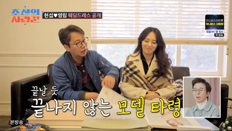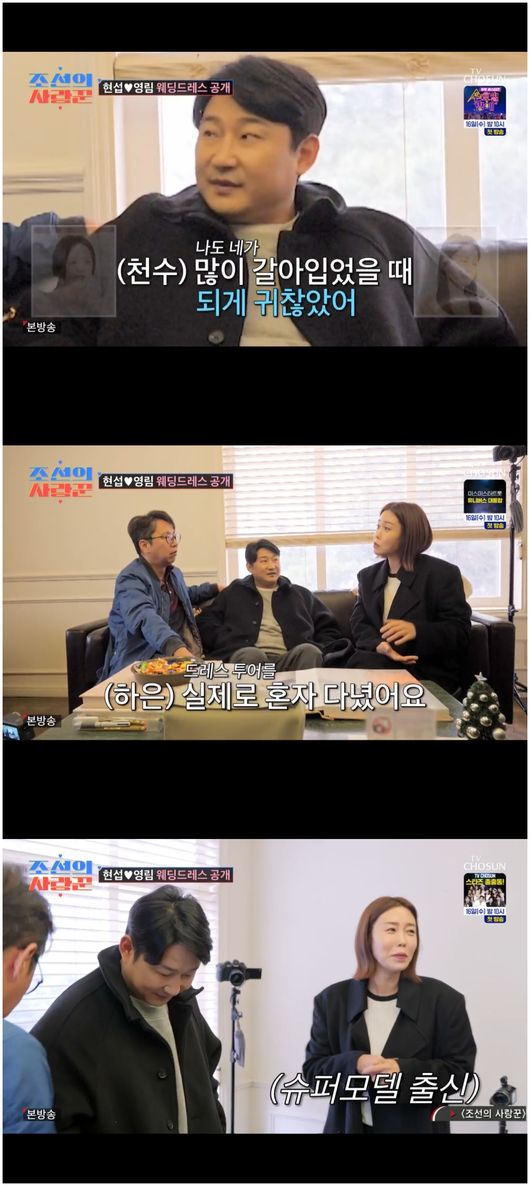 [OSEN=오세진기자]‘조선의사랑꾼’심현섭결혼위원회후원회장부부인심하은이천수부부가등장했다.14일방영한TV조선‘조선의사랑꾼’에서는심현섭&장영심커플의웨딩드레스투어가그려졌다.심현섭은“모델들이다어리고젊은데,30~40대도좀맞춰서그나이대로모델도있으면좋겠다.크리스티나(?)가좀예쁘네.이건호리호리해야어울리겠다”라며카탈로그를보면서엉뚱한이야기를했다.정영심이드레스를갈아입으러갔을때,심하은과이천수부부가등장했다.심하은은“언니는내가에스코트하면된다”라면서자신만만해했다.심현섭은“남자들은기다리는거미치지”라며심드렁하게던졌다.이천수는“나도네가웨딩드레스많이갈아입을때되게귀찮았어”라며대놓고말해심하은의기를빠지게했다.심하은은“실제로웨딩드레스투어다닐때혼자다녔다.심지어이천수는결혼식몇년도에한지도모른다”라고말해이천수를머쓱하게만들었다./[email protected][사진]TV조선‘조선의사랑꾼’Copyright©OSEN.무단전재및재배포금지.