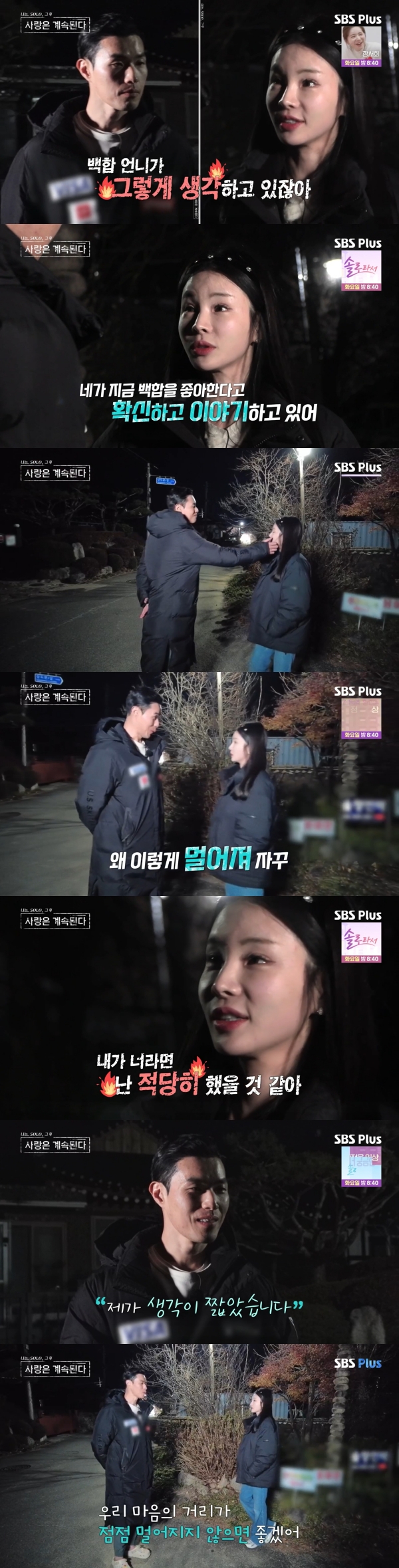 사진=SBSPlus·ENA[스포츠투데이김태형기자]국화와10기영식의거리가멀어졌다.10일방송된SBSPlus·ENA'나는SOLO,그후사랑은계속된다(나솔사계)'에는결혼이간절한골드와한번다녀온돌싱이함께하는'골싱특집'이그려졌다.이날서로호감을보였던국화,10기영식은각자다른상대와데이트를마치고돌아왔다.백합이10기영식,22기영식과의데이트에대해"너무좋았다.오늘안했으면후회할뻔했다"고자랑했다.이에국화는"그정도야?"라고반응했다.백합이계속10기영식을칭찬하자국화의표정이굳어졌다.10기영식은국화의마음도모르고"둘이장난아닌무언의경쟁이대단했다.불꽃튀었다.소고기가그냥익더라"라고눈치없이말했다.10기영식은심상치않은표정의국화를불러산책에나섰다.국화는10기영식에게"너는아까백합언니가한이야기듣고무슨생각했냐"고물었고,10기영식은"무슨말하는지모르겠다"고답했다.국화는"이런얘기하는게너무웃겨서"라며"그래서갔다면상대가그렇게생각하게끔하는것도맞는거냐.아까백합언니가말한거들었잖나.너의첫번째선택도두번째선택도언니였다"며"네가지금백합을좋아한다고확신하고이야기하고있다"고따지기시작했다.10기영식은국화가말하고있는데뭔가를떼주려는듯손을뻗었다.이에국화가처음으로10기영식의손길을피해뒷걸음질쳤다.10기영식은"거리가너무멀어졌다.왜이렇게멀어지냐자꾸"라고말해도국화는거리를유지했다.10기영식은"오늘나는그대가다른분을만날시간을주는게존중하는의미라고생각했다"고말했다.이에국화는"만약에진짜그거였다면내가너라면난적당히했을것같다"며일침을날렸다.국화가"언니는지금네가언니를좋아하는걸확신하고있다"고하자,10기영식은"그러면너무죄송하다.생각이짧았다"고사과했다.하지만국화는"무엇보다슬픈건백합언니가네가좋아한다고확신하고있다는거다.그게너무슬프다.아니그냥짜증난다"고말했다.10기영식은"나는그런이야기는하고싶다"며"이상황은밖에나갔을때일어나는상황이아니다.내가양다리를걸치고하는게아니다.이건정말비정상적인게임에들어와있는거다.오해하지말아달라"고강조했다.하지만국화와의거리는좀처럼좁혀지지않았다.[스포츠투데이김태형기자[email protected]]Copyright©스포츠투데이.무단전재및재배포금지.