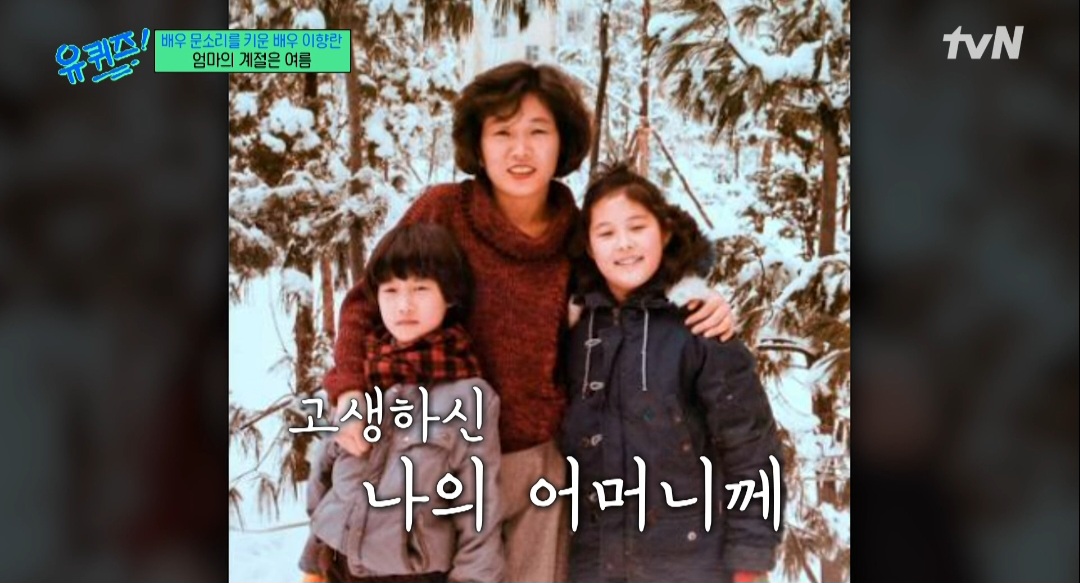 배우이향란,문소리가어머니를떠올리며눈시울을붉혔다.iMBC연예뉴스사진19일(수)방송된tvN‘유퀴즈온더블럭’285회‘골든아워’특집에서는월드클래스비트박서윙김건호,이국종의1호제자정경원교수,모녀배우문소리와이향란이출연해릴레이토크를펼쳤다.이날문소리는드라마‘폭싹속았수다’대본을보자마자눈물을흘렸다고밝혔다.유재석이“‘우리엄마의계절은여름같다’하셨다고?”라며묻자,문소리가“‘폭싹속았수다’에선인생을사계절에은유하고있다.전가을,겨울담당이다”라고말했다.이어문소리는“꼭인생이나이들면춥고,지고이런것만은아니더라.엄마를보니까지금누구보다도뜨겁게살고계시고”라며솔직한마음을전했다.문소리는“저도나중에제딸한테‘우리엄마지금멋지게살고있어.엄마생각하면기분좋아’이런얘기를들을수있는할머니가되고싶다”라고밝혔다.iMBC연예뉴스사진iMBC연예뉴스사진이향란은“5년전부터내인생의화양연화같다.저희엄마도고생고생하면서절키웠는데,가시고나니후회되는게곰살맞은딸이못되어드린것이다.‘엄마,원래인생은외로운거야’하면서잘난척하고그랬던게제일미안하다.4월초에엄마기일인데,지금제모습보고우리엄마가되게좋아하실것같다.‘우리딸최고다’이러실것같다”라며미소지었다.iMBC연예뉴스사진iMBC연예뉴스사진한편,‘유퀴즈온더블록’은큰자기유재석과아기자기조세호가다양한사람들을만나이야기나누는예능프로그램이다.매주수요일오후8시45분에방송된다.iMBC연예김혜영|사진출처tvNCopyright©MBC연예.무단전재및재배포,AI학습금지.