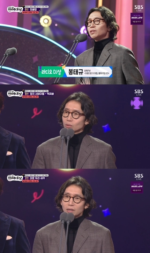 배우봉태규가‘SBS연예대상’에서라디오DJ상을수상했다.배우봉태규가‘SBS연예대상’에서라디오DJ상을수상했다.봉태규는29일오후방송된‘SBS연예대상’에서라디오DJ상을수상했다.이날수상자로호명돼무대에오른봉태규는“보석같은일상을저에게공유해준다는게쉽지않을것이라생각한다.그런쉽지않은일을해주는청취자분들께감사의뜻을전한다”라고소감을밝혔다.이어가족과제작진에게감사의뜻을전한봉태규는“열심히해서칠순잔치하면서그만두도록하겠다”라고덧붙여웃음과감동을모두선사했다.봉태규는작년3월18일부터매일오전9시SBS파워FM‘아름다운이아침,봉태규입니다’(아침봉)로청취자를만나고있다.청취대상이누구든부담없이들을수있는라디오라는소개처럼,전세대청취자에게사랑받으면서전국의아침을깨우고있다.봉태규는앞서SBS에서는지난2008년연기대상에서는프로듀서상을,2018년에는캐릭터연기상을,2020년에는중장편드라마부문남자우수연기상을수상한바있다.이번에라디오DJ상까지수상하면서연예대상에서까지트로피를추가하며SBS에서만네번째트로피를품에안게됐다.[MBN스타박소진기자[email protected]]<CopyrightⓒMBN(www.mbn.co.kr)무단전재및재배포금지>Copyright©MBN.무단전재,재배포및AI학습이용금지.