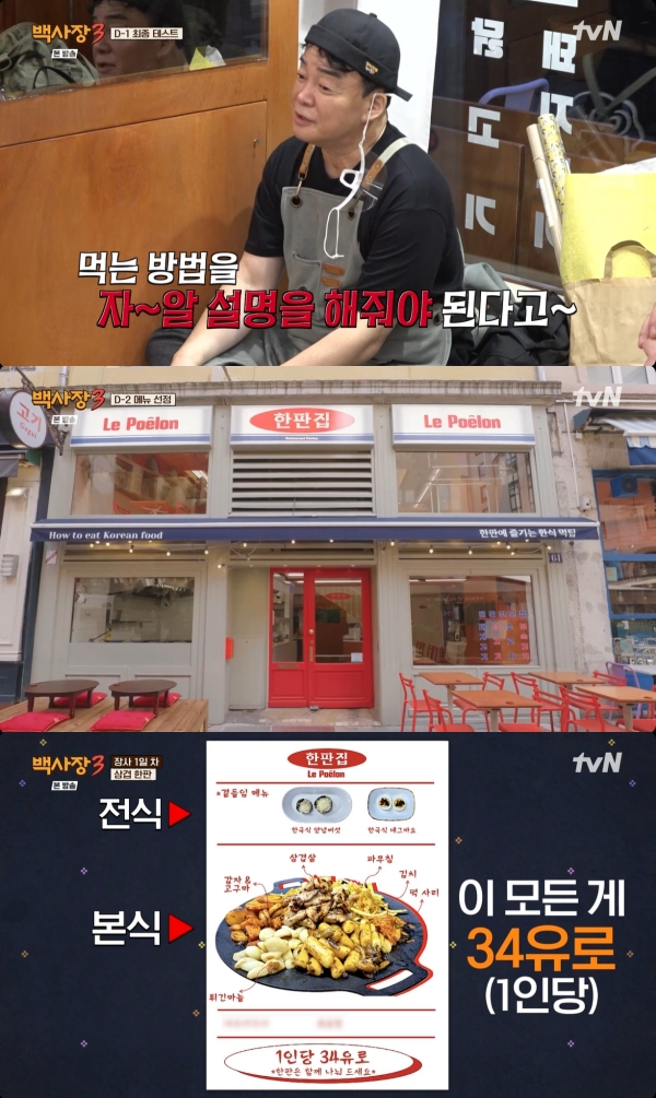 사진=tvN[스포츠투데이김태형기자]백종원이프랑스리옹에서한국식고깃집인'한판집'을오픈했다.10일첫방송된tvN'세계밥장사도전기백사장3'에는백종원,이장우,존박,유리,윤시윤이프랑스리옹에서한식당운영을시작한모습이그려졌다.제작진은"이번목표는리옹최고의미식거리에서연매출10억가게를달성하는것"이라고밝혔다.이에백종원은"연매출10억이면하루매출이무조건300만원은나와야한다.말이되냐.한국에서도하루매출300만원이면초대박가게인데.가게를얼마나크게구해주려는거냐"며당황했다.백종원이장사를시작할상권은총38개의맛집들이밀집해있는메르시에르거리였다.이곳은프랑스전지역사람들도찾아오는미식거리였다.해당골목의가게들은최소연매출이약10억원이며,높은임대료로어설픈가게운영으로는1년도버티지못한다는설명이이어졌다.그는주변가게들을둘러보며"여기가게들내공이장난이아니다"라며긴장한모습을보였다.백종원은이곳에서한국식고깃집을열기로했다.그는"이지역사람들에게새로운한식당이생겼다고설명하려면거부감없는메뉴로가야한다"며"결국고기싸움이다.육류로가야한다"고판단했다.'백사장'팀은오픈을이틀앞두고완성된가게를구경했다.가게에는'한판집'이라는간판이걸려있었고,문과의자등은빨간색으로포인트를줬다.특히테라스문화가발달한프랑스에맞게한국식테라스인평상을둠으로써특색을살렸다.첫날메뉴는삼겹살로정했다.여기에파무침과달걀프라이,떡사리,마늘,표고버섯등으로삼겹살한판조합을구상했다.또한장사시작하루전에는한국어가가능한프랑스현지인아르바이트생,현지인들을초대해메뉴점검을했다.하지만현지인들은익혀먹어야할양파와파무침등을먼저먹으며아쉬움을남겼다.백종원은"먹는방법을잘설명해줘야한다"며현지손님들을위한밀착서비스의중요성을강조했다.이에홀마스터를맡은존박의어깨가무거워졌다.가격은코스1인당34유로로책정됐다.본식인삼겹한판에에피타이저로에그마요와양념버섯,그리고후식까지갖춘가격이었다.장사첫날,오픈10분도안돼서손님두팀이입장했다.존박은손님들에게먹는법을친절하게설명했고,손님들은친절한서빙에감동했다.또한주방내부가훤히보이는통창을통해이장우가요리하는모습을신기해하며구경하기도했다.방송말미에는손님이줄어들더니비까지오면서쉽지않은장사를예감케했다.[스포츠투데이김태형기자[email protected]]Copyright©스포츠투데이.무단전재및재배포금지.