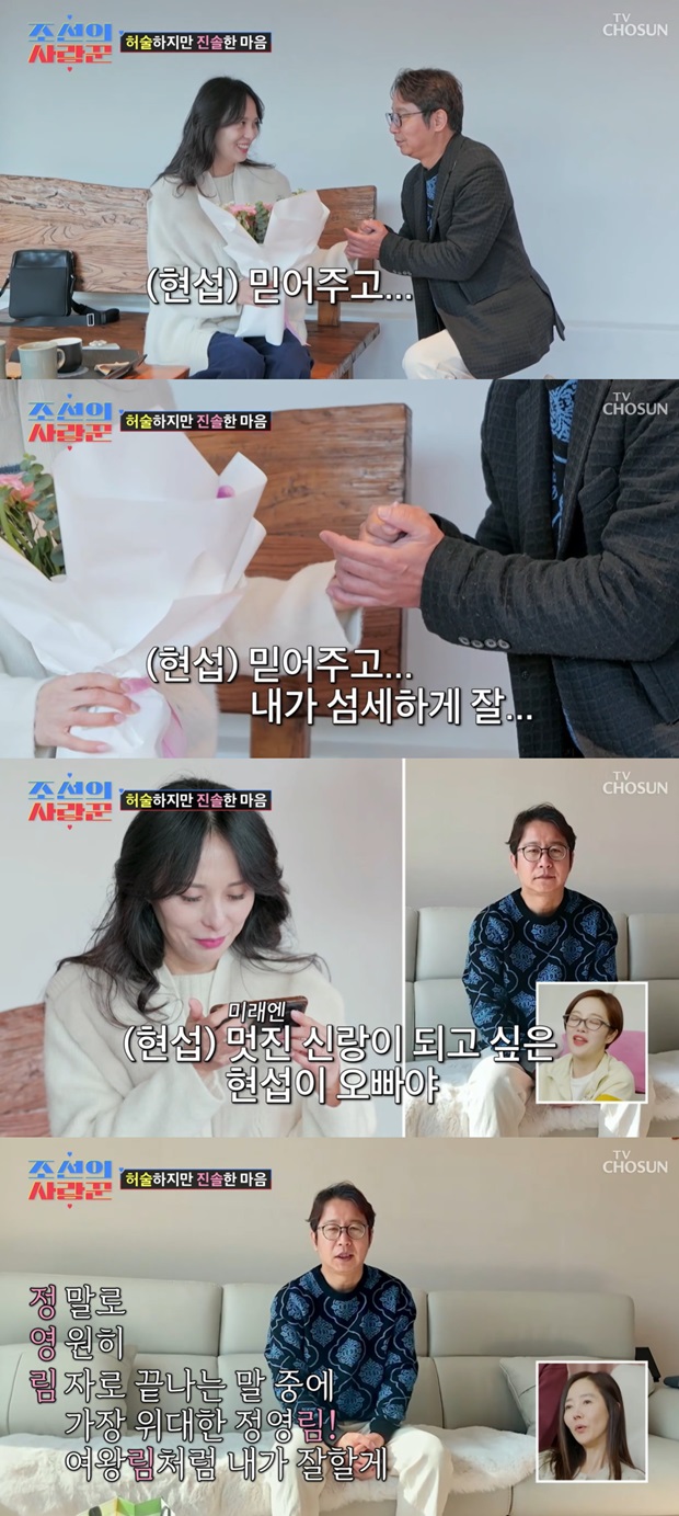 조선의사랑꾼심현섭정영림[티브이데일리김한길기자]개그맨심현섭이여자친구에게무릎을꿇고자신의진심을드러냈다.13일방송된TVCHOSUN예능프로그램'조선의사랑꾼'에서는심현섭,정영림커플이재회후첫데이트에나서는모습이그려졌다.이날정영림은"이번에잠깐연락안하면서느낀게있다.오빠랑그만만나려고정리를했지않냐.근데생각보다내가오빠를많이좋아하더라.내가인지하는것보다더많이좋아하더라"라고진심을고백했고,심현섭은"내가더잘하겠다.앞으론걱정안끼치겠다"고약속했다.이어심현섭은한카페에서정영림을위한영상이벤트를진행했지만,영상이제대로작동하지않아안타까움을자아냈다.그러나심현섭은계획대로꽃을들고정영림에게다가갔고,이내무릎을꿇었다.심현섭은정영림에게"섬세하게잘하겠다.공감,이해수용다잘할테니까믿어달라.고맙다"고고백했다.이후제작진은정영림에게심현섭의영상을다시금보여줬는데,영상속심현섭은"영림아.남자친구이자애인,미래엔멋진신랑이되고싶은현섭이오빠다.내가앞으로는더세심하게,영림이마음잘헤아려서잘하도록하겠다"고말했다.또심현섭은"'정'말로,'영'원히,'림'자로끝나는말중에가장위대한정영림,여왕림처럼내가잘하겠다"라며센스있는삼행시플러팅도날려정영림을감동하게했다.[티브이데일리김한길기자[email protected]/사진=TVCHOSUN'조선의사랑꾼']심현섭무릎고백[Copyrightⓒ*세계속에新한류를*연예전문온라인미디어티브이데일리(www.tvdaily.co.kr)/무단전재및재배포금지]Copyright©티브이데일리.무단전재및재배포금지.