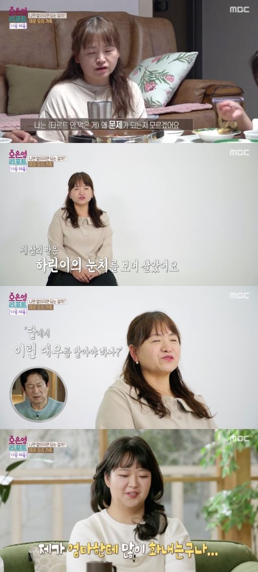 [OSEN=임혜영기자]엄마가딸의눈치를보며살아왔다고밝혔다.13일방송된MBC‘오은영리포트–결혼지옥’(이하결혼지옥)에서는가족상담특집4부작중두번째편,‘미운오리가족’사연이공개됐다.이날딸은“엄마랑왜자꾸사소한걸로부딪히는지궁금하고,어떻게하면편하게대화할수있을지알고싶어서”라는신청이유를밝혔다.엄마는“딸이가족에게는사납다.무슨일이생기면가족탓을많이한다”라고설명했다.이들모녀의일상이공개되었다.저녁식사시간.딸은자신이만든타르트를엄마가먹지않은것에대해불만을표했다.엄마는자신이딱히잘못한것은없다고생각하지만미안하다고사과했다.엄마는“제삶의반은딸의눈치를보며살았다.딸한테이런대우를받아야하나슬프다”라고말했다.일상을본딸은자신이생각보다화를많이낸다고말했다.엄마또한“엄마로서의존중이없다.싫어한다는생각도한다”라고말했다./[email protected][사진]MBC‘오은영리포트–결혼지옥'Copyright©OSEN.무단전재및재배포금지.