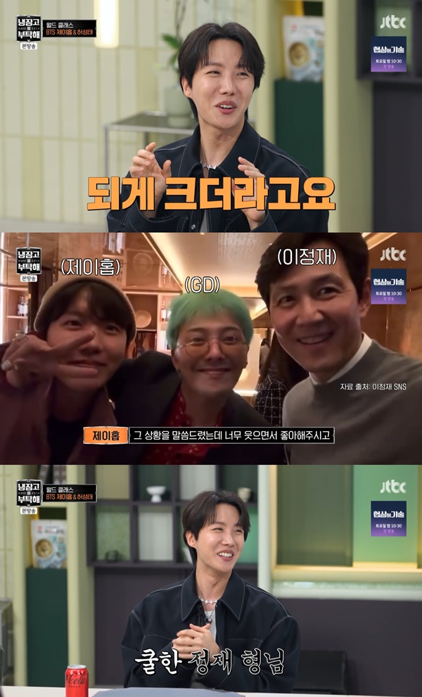 냉장고를부탁해방탄소년단BTS제이홉/사진=JTBC[스포츠투데이서지현기자]'냉장고를부탁해since2014'제이홉이이정재의휴대전화속비밀을폭로했다.2일밤방송된JTBC'냉장고를부탁해since2014'에서는배우허성태와그룹방탄소년단(BTS)제이홉이출연했다.앞서제이홉은올해1월프랑스영부인브리지트마크롱(BrigitteMacron)여사의초청으로프랑스파리라데팡스아레나(LaDéfenseArena)에서개최된'노란동전모으기자선행사'(LeGaladesPiècesJaunes)오프닝무대에오른바있다.당시배우이정재와함께동행했다는제이홉은"사진도좀찍었다"며"사진찍는데너무새로웠던게정재형님카메라글씨가되게크더라"고폭로했다.제이홉은"제가익숙한폰트크기가아니더라.그상황을말씀드렸는데너무웃으면서좋아해주시고'잘안보여'라고하시더라"고웃음을보였다.[스포츠투데이서지현기자[email protected]]Copyright©스포츠투데이.무단전재및재배포금지.