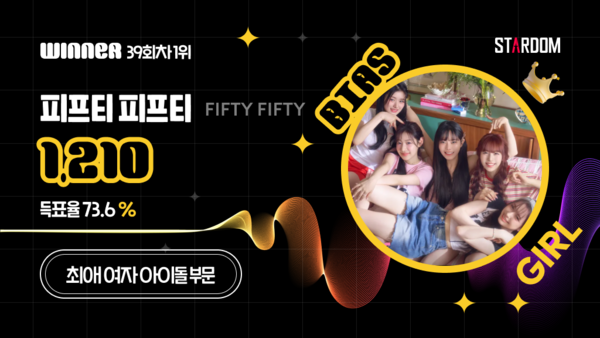 ▲피프티피프티가2월셋째주스타덤'최애아이돌'여자부문에서1위를차지한투표결과이미지.[스포티비뉴스=김원겸기자]피프티피프티가스타덤'최애아이돌'주간랭킹에서21주연속1위를차지했다.피프티피프티는2월셋째주(집계기간2월17일~2월23일)스타덤'최애아이돌'여자부문주간랭킹정상에올랐다.10월첫째주첫정상에오른후21주연속최정상의자리를지켰다.피프티피프티는집계기간동안73.6%의압도적인득표율로1위를차지했다.시크릿넘버는25.4%의득표율로2위를차지했다.한편,'최애아이돌'남자부문에서는임영웅이6주연속1위를차지했다.'최애트롯스타'남녀부문에서는황영웅,별사랑이나란히1위에올랐다.'최애루키아이돌'남녀부문은세븐어스와유니스가각각정상을차지했다.다양한부문의랭킹을보여주는'스타덤'은스타와팬들을연결해주는모바일애플리케이션으로,'나의최애셀럽을우주대스타로만든다'는캐치프레이즈아래스타와팬들을다양한방식으로연결한다.팬들이질문을하고스타가답을해주는'스타톡'도꾸준히진행되고있다.유니스,최수호,손태진이이미참여해팬들의뜨거운호응을얻었다.싸이커스,소디엑,제이디원,드리핀,더킹덤티아이오티도참여했다.<저작권자ⓒSPOTVNEWS.무단전재및재배포금지>Copyright©스포티비뉴스.무단전재및재배포금지.