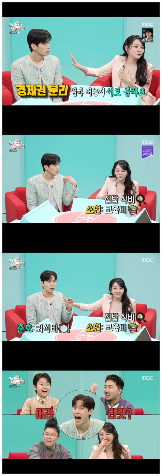 MBC‘전지적참견시점’캡처MBC‘전지적참견시점’캡처[뉴스엔서유나기자]뮤지컬배우김소현,손준호부부가경제권을분리한사실을밝혔다.3월1일방송된MBC예능'전지적참견시점'(이하'전참시')336회에서는김소현,손준호부부의일상이공개됐다.이날손준호가보일러를세게튼것아니냐며아침부터가스값을단속하자,김소현은"당신이내는관리비라그런것같기도하다"며손준호가절약정신에유독투철한이유를짐작했다.김소현은"저희가경제권을나눴다.제가0원부터모아서통장돈보는재미를봤다.이사람은그런재미를못보고바로결혼했으니까통장쌓여가는걸보며즐겁게돈벌었으면좋겠어서서로경제권분리를했다.그래서얼마버는지서로모른다"고밝혔다.두사람은생활비를어떻게나누냐는말에김소현이교육비와식비를담당하고,손준호가외식비와관리비,세금을담당중이라고전했다.전현무가"관리비자기가내니까아끼네"라고확신하자김소현은실제로"여름에에어컨돈이진짜많이나오잖나.아들방만켜서셋이같이잔다.땀에흠뻑젖어서깬다.25도로해놨더라"고에피소드를공개했다.이에손준호는"아파트평균과내집평균이요즘은나오더라.평균보다조금더낮으면그렇게짜릿할수없다.괜히내가이긴것같더라"고털어놓았다.한편8살차이가나는연상연하부부김소현,손준호는지난2011년결혼해슬하에아들주안군을두고있다.김소현,손준호부부는지난2023년채널'아침먹고가2'에출연하며한남동최고급아파트를공개했다.당시장성규는부부의집이"100억원이넘는집"이라며1가구,1복도에각집마다단독으로엘리베이터를사용할수있는사실을전했다.김소현은"부모님께한푼도안받았다.너무운이좋아서집을팔때마다집값이올라갔다"고밝혔다.뉴스엔서유나stranger77@기사제보및보도자료[email protected]ⓒ뉴스엔.무단전재&재배포금지Copyright©뉴스엔.무단전재및재배포금지.