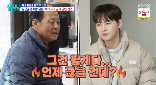 '살림남'방송[OSEN=최지연기자]'살림남'박서진의아버지가금연조건을걸어눈길을끌었다.18일방송된KBS2TV'살림하는남자들시즌2'(이하'살림남')에서는심근경색병력으로의사에게금연을당부받은박서진아버지가가족에게금연조건을내걸어눈길을끌었다.박서진아버지는앞선방송과달리"담배천천히끊겠다"면서담배를손에서놓지못해안타까움을자아냈다.박서진은"당장끊어야한다"고아버지를압박,아버지는24살때부터담배를피웠다며"갑자기담배끊으라는건아빠죽으라는거다.금단현상온다"고호소했다.결국아버지는또흡연을하기위해자리를피했다.어머니는"남편이배에서화나는일있으면담배피운다"고말했다.'살림남'방송박서진의동생인박효정은"다른배가그물잘라도'서진이아빠'한마디에말을할수가없다고하더라"며"일년에몇십,몇백을그렇게날리는거다"라고설명,어머니는"1년에그물만몇천만원씩손해를본다"고덧붙였다.그러나박서진은"합당한이유를만들어주지마라.엄마는왜안말리냐"고속상해했다.이후흡연후집으로돌아온아버지의냄새를맡은어머니는"두개피피웠네"라고알아챘다.박서진은아버지에게"담배피우면얼마안남은머리다뽑겠다고약속하라"고압박,아버지는"내가담배끊으면남매들셋이각자50만원씩한달에150만원달라.나도남는장사여야할거아니냐"고토로했다.박서진은이를받아들이며"그럼한개피필때마다10만원이다"라고거래조건을걸었다.이를들은박효정은"아빠,15개필수있네"라고너스레를떨어웃음을안겼다.[사진]'살림남'방송[email protected]©OSEN.무단전재및재배포금지.