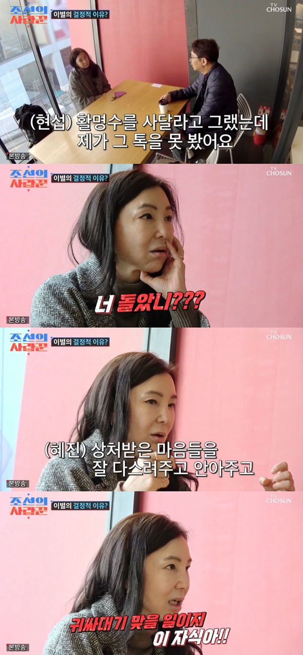 심현섭/사진=TV조선조선의사랑꾼[스포츠투데이백지연기자]'조선의사랑꾼'심현섭이영림과이별했다.6일밤방송된TV조선예능프로그램'조선의사랑꾼'에서심현섭이이별했다.이날방송에서심현섭이영림과이별하고심혜진을찾았다.심현섭은"일주일에한번씩보고만나고시간을보냈다.울산에가서.근데제가울산에서사업자리때문에술자리들이있었다"라고말했다.이어"영림이는오빠가울산까지내려왔는데왜나안보고지인들이랑있냐고묻더라.근데분명히괜찮다고했었다"라고알렸다.이를듣던심혜진은"너희가주말에만딱만난다.주말을얼마나그여자친구는그렇겠냐.그래봐야한달에4번보는거다.여자가생각할때는사소한거에마음을못쓰는사람이결혼해서얼마나잘하겠냐고생각을하겠다.온영혼을갈아넣어도모자랄판에너는그럴만하다.나는웬만하면편들어주고싶은데이건아니다.손이발이되도록빌어라"라고말했다.심현섭은"가장중요한건영림이가체해서활명수를사다달라했는데톡을못보고술을먹다가밤12시가넘어버렸다"라고전했다.이를보던PD는"활명수도'네가사다먹지'라고보냈다던데"라고말해심혜진이충격을받았다.심혜진은"돌았냐.너왜오만방자냐.그사람이느끼는게중요한건데.귀싸대기맞을일이다.여자입장에서는나이마흔이넘어서60대되는남자랑결혼하는데오만생각이다들판이다"라고분개했다.그러면서"니딸이면그런남자한테보내고싶겠냐"라고알렸다.[스포츠투데이백지연기자[email protected]]Copyright©스포츠투데이.무단전재및재배포금지.