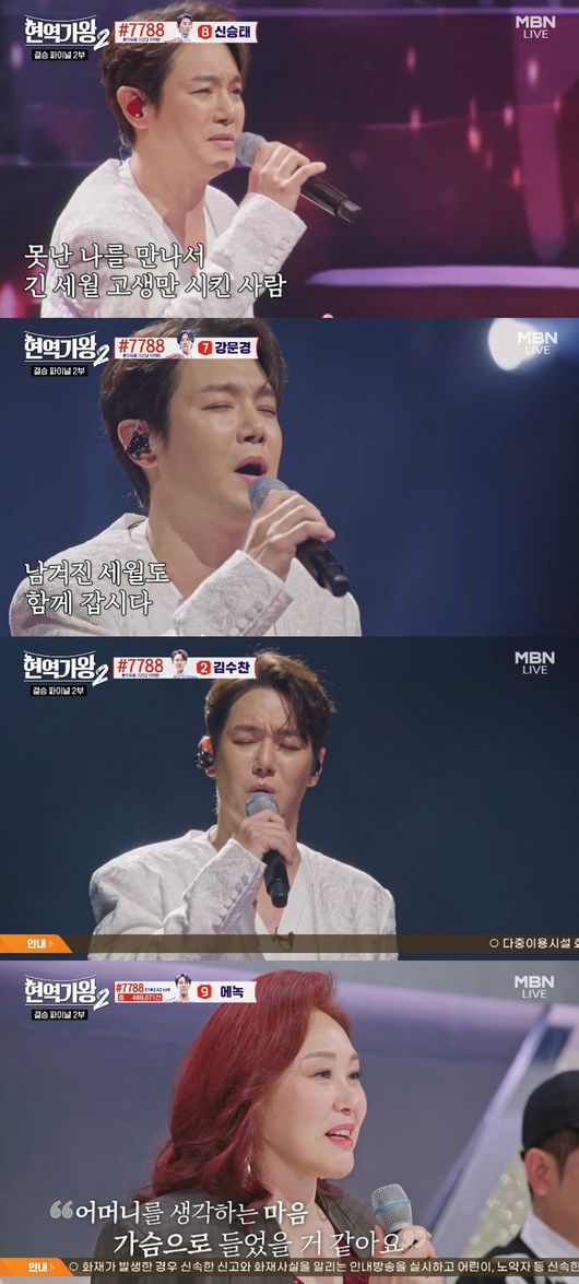 '현역가왕2'방송[OSEN=최지연기자]가수환희가어머니를위해열창했다.25일,생방송으로진행된MBN'현역가왕2'최종회에서는결승2차전이전파를탄가운데환희가10명의후보중가장먼저무대에올라눈길을끌었다.이날최종회는결승1차전의점수의역순으로진행되었다.결승1차전에서꼴등을차지했던환희는기호0번이된것.환희는"결승까지와서감회가새롭다.끝까지못가더라도그동안활동했던제가'트로트로도이런좋은노래를남겼다'(생각해줬으면한다)"라고바람을보였다.이어조항조의'고맙소'를선곡한이유로는"어머니가고생을너무많이했다"라면서"차에서이노래듣는데,눈물이나더라.가사가와닿아서어머니께표현하고싶더라"라고털어놓아공감을자아냈다.환희는무대말미결국눈물을보이며열창을마쳤다.이에연예인판정단인주현미는"이노래가남편이아내에게부르는노래로만알고있었는데어머니를떠올리며불렀다고하셨다.어머니의마음으로너무너무감동일것같다"고평가했다.한편환희는생방송을통해현재문자투표가진행되고있는점을고려해연예인판정단으로부터받은최고점과최저점만을듣게되었다.환희는'고맙소'무대로연예인판정단에최고점100점만점과최저점70점을받았다.[사진]'현역가왕2'방송[email protected]©OSEN.무단전재및재배포금지.