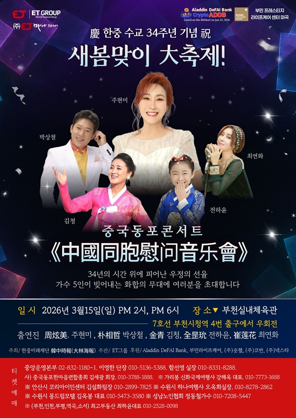 중국동포콘서트포스터/사진=마나스테이제공[스포츠투데이임시령기자]한중수교34주년을기념한중국동포관객대상문화교류콘서트가열린다.오는3월15일부천실내체육관에서한중수교34주년을기념하는'한중수교34주년기념새봄맞이大축제!중국동포콘서트'가개최된다.2026년현재한국과중국은문화·경제·인적교류전반에걸쳐활발한협력관계를이어가고있으며,국내에는약100만명의중국동포가한민족공동체의일원으로함께살아가고있다.이번콘서트는이러한시대적흐름속에서중국동포사회의화합과발전을응원하고,한중우호협력의의미를문화로되새기기위해기획됐다.본행사는한중수교34주년을기념하는문화교류행사로,이를축하하기위해중국측주요인사와국내주요귀빈의참석이예정돼있어행사에상징성을더할것으로기대된다.공연에는대한민국을대표하는트로트가수주현미를비롯해다수의히트곡을보유한트로트가수박상철,미스트롯4출연으로주목받은10세트로트신동전하윤,중국하얼빈출신의공무원가수최연화,연변출신가수김청등한중양국을대표하는가수들이출연한다.세대를아우르는출연진구성과중국동포관객의정서와문화적배경을고려한프로그램을통해,관람객모두가함께공감하고즐길수있는화합의무대가마련될예정이다.주최사인㈜마나스테이박철용대표는"이번콘서트가한중수교34주년의의미를되새기고,중국동포와한국사회가문화로하나되는계기가되길바란다"며"앞으로도한중문화교류와동포사회와의상생을위한다양한문화행사를지속적으로추진할계획"이라고밝혔다.[스포츠투데이임시령기자[email protected]]Copyright©스포츠투데이.무단전재및재배포금지.