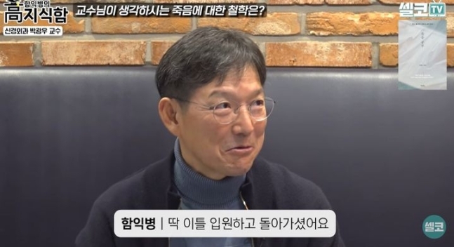 유튜브채널‘셀코TV’화면캡처의사겸방송인함익병(63)이위암으로작고한장모님께병명을알리지않았다고털어놨다.지난3일유튜브채널‘셀코TV’에는‘장모님이돌아가실때까지도모르셨어요.그래서행복하게가신것같아요.두의사가말하는잘사는법보다잘죽는법은?’이라는제목의영상이게재됐다.공개된영상에서함익병은“난20년째죽음을생각하고사는사람”이라고말문을열었다.그는“옛날에는이런이야기하면엄마가‘젊은놈이별생각다한다’고하셨다.근데저는죽음은늘가까이있는것이라고생각한다”고소신을밝혔다.이어“그날그날재미있게잘살고열심히살면죽음이내인생의마지막이라는게아니라내가잘살아온과정의종착역이라고생각한다”고말했다.유튜브채널‘셀코TV’화면캡처이날함익병은세상을떠난장모에대해서도언급했다.그는“우리장모님이93세에돌아가셨는데사실6개월전에(위암)진단을받았다”고털어놨다.함익병은“가족회의를하면서'얘기하지말자.평균이상의수명을사셨고건강하게일상활동을하는데수술할거야?'이런얘기를나눴다”며“6개월더사셨는데딱이틀입원하고돌아가셨다”고당시를떠올렸다.그러면서“본인은좀이상하다고얘기하셨는데말씀안드렸다.입원하면괜찮아진다고했고,가족들은다알고있었다.그냥치료받고있다고생각하셨을거다”고덧붙였다.이에박광우교수는“다양한죽음과과정속,내가내목숨을결정하는데있어소외됐다는생각이들었을것”이라고말했고,함익병은“그래도주변에보고싶은분들이있지않을까싶었는데,워낙장수를하셔서생존한친구분들도없다.굳이알릴필요없지않나.젊은분들과는다르다.그분들은정리할게있으니”라고답했다.MBN‘동치미’방송화면캡처한편,함익병은지난2023년MBN‘속풀이쇼동치미’에서도“장모님이92세로돌아가셨다.소화가안된다고했는데말기위암진단을받았다”고언급한바있다.당시함익병은“5년전에조기발견했으면7년을암환자로사셨을것같다”라며“(말기위암)진단을받고6개월,1년은괜찮겠지생각했다”고털어놨다.그는“진통제드시고있다가돌아가시기3일전에복통을호소했다“라며“저는그런상황인줄모르고골프를쳤다”고후회했다.그러면서“장모님고향이봉화인데꼭가야겠다고생각했지만못갔다”며눈물을보였다.김지수온라인뉴스기자[email protected]©세계일보.무단전재및재배포금지.
