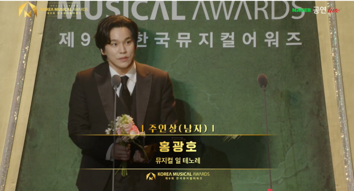 홍광호.사진ㅣ‘제9회한국뮤지컬어워즈생중계영상캡처뮤지컬배우홍광호가남자주연상을수상했다.13일오후7시서울광진구유니버설아트센터에서‘제9회한국뮤지컬어워즈’가개최됐다.‘제1회한국뮤지컬어워즈’부터함께해온뮤지컬배우이건명이MC를맡았으며,TheM.C오케스트라가올해도함께했다.‘주연상_남자’에는김준수(드라큘라),마이클리(지저스크라이스트수퍼스타),유준상(스윙데이즈_암호명A),임규형(디어에반핸슨),조정석(헤드윅),홍광호(일테노레)가후보에올랐다.‘일테노레’로남자주연상을수상한홍광호는“행복하게공연했던작품으로상을받을수있어서영광이다.상이모든걸설명해주지못한다고생각하고살아왔는데,이렇게상을통해서위로해주시고축복해주셔서너무감사하다”고운을뗐다.이어“9회시상식이진행되는동안6번을후보에올려주셨다.감사를드리고싶다.7년에수상을한번했었는데그때든생각이심사위원들에게감사표현을못했더라.성이‘홍’씨라항상후보자마지막에있는데체크해주셔서감사하다.다음에도후보에오른다면뒤에서부터봐주시면좋겠다”고너스레를떨었다.홍광호는“어젯밤에혹시나상을받으면누구이름을불러야하지생각을했다.자리를박차고일어나서메모장에써봤다.한230여분계시더라.만으로23년째뮤지컬을하고있는데감사해야할분이너무많더라.내가230명안에있을까생각하시는모든분들께감사인사를전하고싶다”고말했다.그러면서“한국뮤지컬을존재하게해준선배님들께감사를드리고싶다.항상한번은표현하고싶었다.늘신인의마음으로공연을하도록약속하겠다”고전했다.‘제9회한국뮤지컬어워즈’는사단법인한국뮤지컬협회가주최하고문화체육관광부와한국문화예술위원회가후원하는뮤지컬시상식이다.한해동안공연된뮤지컬시장을결산하여시장의흐름을분석하고평가하며,전문가투표단과관객투표단의공정한투표를통해수상작(자)를선정했다.[신영은스타투데이기자]Copyright©스타투데이.무단전재,재배포및AI학습이용금지