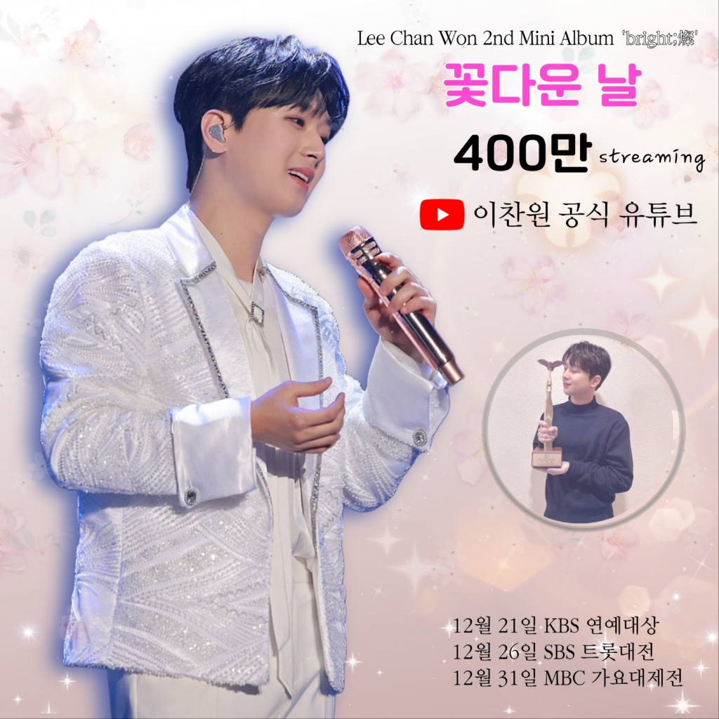 [스타뉴스|문완식기자]"찬스내게기대쉬세요"이찬원'꽃다운날'음원영상400만뷰가수이찬원의'꽃다운날'음원영상이400만뷰를달성하며인기를빛냈다.지난4월22일이찬원공식유튜브채널에공개된'꽃다운날'음원영상은12월29일기준400만뷰를넘어섰다.'꽃다운날'은리드미컬하고경쾌한반주에이찬원특유의호소력짙은중저음보이스가조화를이루며곡의완성도를높였다.이찬원두번째미니앨범'bright;燦'수록곡'꽃다운날'은이찬원이작사,작곡의곡으로이찬원은인생의가장꽃다운날을자신을위해희생하고헌신한엄마에대한애틋한마음을담아만든노래라고탄생비화를밝히기도했다.이찬원은세월이흐를수록점점작아지는엄마의모습을보며"이젠내게기대쉬세요"라며앞으로는어머니를지키겠다는자식으로서의강한의지와다짐을곡에녹였다.이찬원은'꽃다운날'노래중간"두손이두손이"등적절한코러스와함께절제된춤사위가팬들에게즐거움과유쾌함을주었다.또한곡의말미에진성에서가성으로발성을바꾸는기법또한리스너들을사로잡는다.최근서울앙코르콘'찬가(燦歌)에서이찬원은'꽃다운날'을부르면서노래말미에"찬스내게기대쉬세요"라고개사해서불러팬들의마음을설레게했다.문완식기자[email protected]©스타뉴스&starnewskorea.com,무단전재및재배포금지