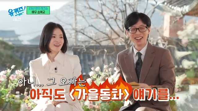 '유퀴즈온더블럭'8일방송tvN'유퀴즈온더블럭'캡처tvN'유퀴즈온더블럭'캡처(서울=뉴스1)박하나기자=배우송혜교가드라마'가을동화'를함께한배우송승헌과의일화를전했다.8일오후방송된tvN예능프로그램'유퀴즈온더블럭'(이하'유퀴즈')에서는배우송혜교가유퀴저로함께했다.23년만의예능출연에떨리는마음으로등장한송혜교는드라마'더글로리'를함께했던임지현,이도현,정성일이나왔던'유퀴즈'방송을시청했다고밝혔다.더불어송혜교는'가을동화'에서호흡을맞춘송승헌편을재밌게봤다며"아니그오빠는아직도'가을동화'얘기를"이라고한숨을내쉬는모습으로웃음을안겼다.송혜교는"송승헌씨는아직도저를은서('가을동화'극중이름)라고불러요"라며"어쩌다가끔사석에서만날때있는데,문열고들어가면OST부터틀어놓고,'은서왔니?'한다"라고송승헌과의유쾌한일화를전했다.한편tvN'유퀴즈온더블럭'은큰자기유재석과아기자기조세호의자기들마음대로떠나는사람여행을담은프로그램으로매주수요일오후8시45분에방송된다[email protected]©뉴스1.Allrightsreserved.무단전재및재배포,AI학습이용금지.