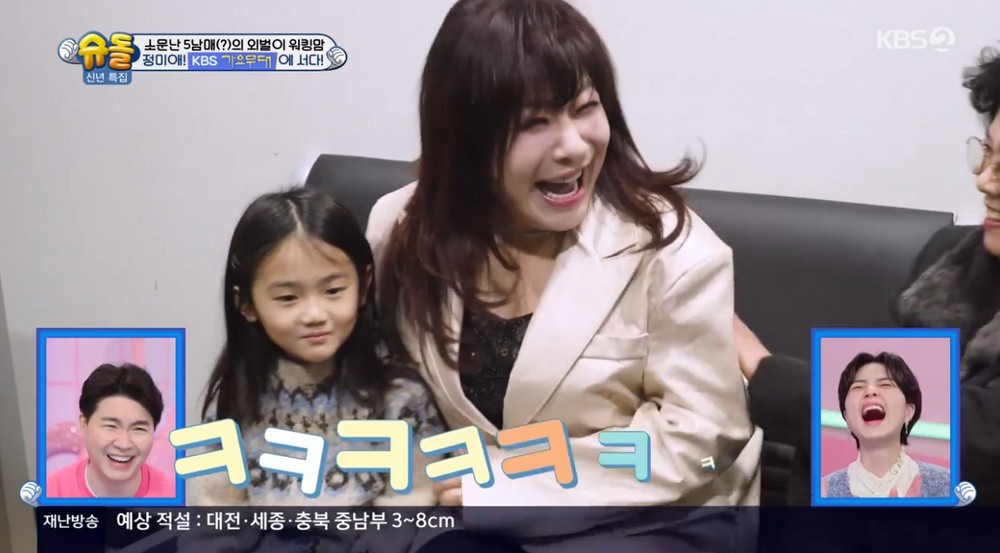 [OSEN=김예솔기자]정미애가설암혀절제이후처음으로가요무대에올랐다.8일방송된KBS2TV‘슈퍼맨이돌아왔다’에서는가수정미애가가족들의응원속에서'가요무대'에올랐다.이날정미애는'가요무대'출연을앞두고4남매와함께방송국으로향했다.정미애는대기실에서"여기는선배님이계신곳이다"라며노사연을만났다.과거정미애와노사연은'미스트롯'에서심사위원과출연자로만난적있었던것.정미애는"선배님께인사를드리러가는것만으로도영광스럽고신기한일"이라고말했다.노사연은정미애를보며"건강은어떤가"라며설암에대해걱정스럽게이야기했다.정미애는"지금은건강하다.아직추적검사중이다"라고근황을전했다.정미애의4남매와남편,부모님까지줄이어들어와노사연에게인사했다.정미애는어머니가손수농사지은다양한식재료를선물했다.노사연은정미애의셋째를보며"커서뭐가되고싶나"라고물었다.이에셋째는"무대에올라가고싶다"라며아이돌이꿈이라고말했다.노사연은"나중에아이유처럼유명해지면언니를알아봐야한다"라고말해웃음을자아냈다.정미애는무대에오르기전리허설을하면서도긴장한모습을보였다.정미애는"가요무대는선배님들도많이보시기때문에너무떨린다"라고말했다.가족들은정미애의무대를걱정스럽게지켜봤다.이모습을본정미애는"부모님이많이기다리셨다"라고말해눈길을끌었다./[email protected][사진:KBS2TV‘슈퍼맨이돌아왔다’방송캡쳐]Copyright©OSEN.무단전재및재배포금지.