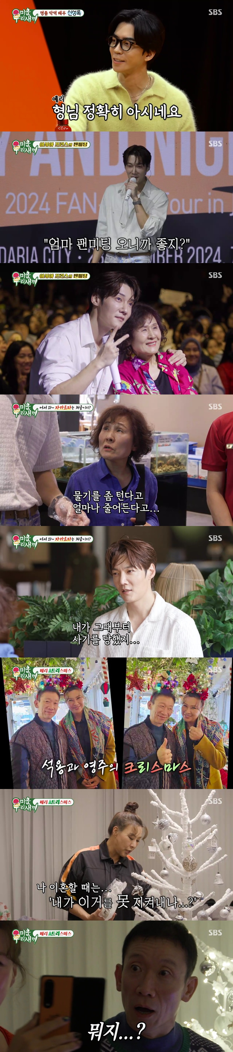 정영주와정석용이함께보낸크리스마스데이트가공개됐다.지난5일방송한SBS예능‘미운우리새끼’스튜디오에는명품악역배우신성록이스페셜MC로등장했다.소속사없이활동한지1년이되어간다는신성록은어떻게출연료를협상하는지묻는신동엽의질문에“저는앉자마자바로이야기한다.그래야뒤가해피하다”고말해웃음을자아냈다.매니저가없는유일한단점으로회식에가기어색하다고밝힌신성록에게MC들은“그래도혼자버는재미를알아(다시매니저를붙이기)힘들거다”라며농담을던졌다.먼저‘아시아프린스’최진혁의인도네시아팬미팅현장이공개됐다.진혁母가팬미팅현장에등장하자,팬들은유창한한국어로인사를건네고사진촬영을요청하는모습으로모두를놀라게했다.노래를부르며등장한최진혁의한마디한마디에열광하는팬들의모습을본서장훈은“이정도면인도네시아가서살아야겠는데”라며감탄했다.이어아이키의도움을받으며연습했던BTS정국의‘스탠딩넥스트유’댄스커버를선보인최진혁.지난방송에서보였던우스꽝스러운몸짓과는달리,180도변신한유려한춤사위에스튜디오의母벤져스는일제히놀라움을표했다.진혁母는진혁을가수시켜준다는말에넘어가사기당했던과거를회상하며“힘든과정들이있었기때문에(팬미팅을보면서)눈물이나더라”라며과거를회상했다.시내관광에나선최진혁母子는무게로금액을정하는해산물식당을찾았고,무조건사려는아들과돈을아끼려는엄마사이의실랑이에폭소가터져나왔다.무게를줄이려물기를털다가가시에찔린최진혁에게“세상멍청한짓을하네”라며진혁母의잔소리가이어졌고,서장훈역시“아까팬미팅영상에나온사람이랑같은사람이맞냐”며어이없어했다.또정영주가드라마에서부부역할로함께연기한정석용과크리스마스데이트를만끽했다.소품숍에서산트리장식품을들고정영주의집으로향한두사람은함께트리를장식했고,두사람의알콩달콩한모습에서장훈은“석용이형원희형이랑있을때랑표정부터다르다”라며흐뭇해했다.트리를꾸미던정석용은“대부분의평범한사람들은짝찾아결혼하는데,나는비정상인가하는고민은했었다.이젠고민도별로안한다”라며자연스럽게결혼에대한생각을털어놓았고정영주역시“우리엄마아빠는결혼생활을유지하기위해많이노력하셔서나역시가정을지키자라는의무감이있었다.그렇지만신뢰가한번깨지면회복이안되더라”라며속마음을내비쳤다.전구가달린커플스웨터를입고함께꾸민트리와기념사진을찍던두사람은갑자기등장한정영주의부모님과마주쳤고,정석용은다짜고짜“죄송합니다”라고말해웃음을자아냈다.이날방송마지막에는김종민이예비신부와궁합을보러갔다예상치못한결과에당황하는장면이공개돼기대를모았다.‘미운우리새끼’는매주일요일오후9시5분에방송된다.이수진기자[email protected]©일간스포츠.무단전재및재배포금지.