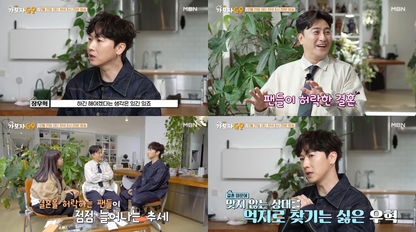 MBN'가보자GO'21일방송가보자고장우혁(서울=뉴스1)황미현기자=MBN'가보자GO(가보자고)'에장우혁이출연해결혼생각을밝힌다.오는21일방송되는MBN리얼버라이어티'가보자GO'시즌3선공개영상에서는원조아이돌장우혁이등장했다.MC안정환은장우혁에게"결혼을해야겠다는생각은없는가"라고물었고,이에장우혁은"해야겠다는생각은있다"라며"요즘팬들과팬미팅을하면'오빠이제는가세요'라고하더라"라며웃지못할에피소드를밝혔다.이어장우혁은"결혼을허락하는팬들도늘어났고,나도결혼에대한생각이있지만,서로가맞지않는상황에서새로운환경을만들기는싫다,그리고주변에서도결혼에대한부정적인의견이있더라"라고답했다.이를들은홍현희는안정환에게"결혼이란뭔지,결혼하면얼마나행복한지말해줘라"라고부추겼고,이에안정환은"미안한데나도고충이있어"라고답해모두를웃게만들었다.이어안정환은"다좋다고할수없다,그럼거짓말"이라며"둘이함께넘어야할산이많다,그걸얼마나잘넘기느냐의문제"라고현명하게답했다[email protected]©뉴스1.Allrightsreserved.무단전재및재배포,AI학습이용금지.