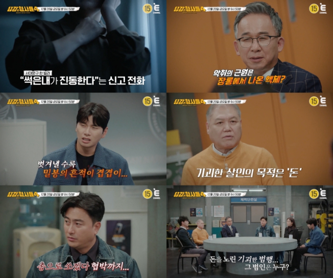 예능‘용감한형사들4’(사진:E채널)‘용감한형사들4’에서의문의장롱살인사건전말을파헤친다.20일방송되는티캐스트E채널‘용감한형사들4’15회에는김도곤형사,이봉석형사,과학수사대(KCSI)윤외출전경무관,김진수경감이출연해직접해결한수사일지를공개한다.더불어가수최예나가게스트로출연해함께한다.이날방송에서소개되는사건은자신이사는빌라1층에서썩은냄새가나는데,문을두드려도인기척이없다는신고로부터시작된다.장롱안에서세입자인40대여성의시신이발견된가운데심상치않은모습을보였다.얼굴에비닐봉지가씌워져있고,그위로테이프가감겨있었는데이를벗겨보니쓰레기봉투가한겹더씌워져있었던것.또한맨얼굴위에도테이프가감겨있어의문을더했다.피해자와금전문제로갈등이많았다는전남편을수사하던중전남편이사는아파트주변에서피해자의차가발견한다.사건해결에가까워진듯했지만수상한인물이거짓진술을한정황이포착되며사건은새국면을맞는다.게다가피해자집에서기묘한동거까지했다는충격적제보까지전해지며사건은미궁속으로빠져든다.거짓말을해야할이유가있었다는용의자의변명은무엇인지,감춰진사건의진실은‘용감한형사들4’에서확인할수있다.한편‘용감한형사들4’는매주금요일오후9시50분에방송되며,넷플릭스,티빙,웨이브등주요OTT에서도공개된다.E채널공식유튜브와인스타그램에서도프로그램에대한생생한소식과영상을만나볼수있다.bnt뉴스연예팀기사제보[email protected]©bnt뉴스.무단전재,재배포및AI데이터활용금지