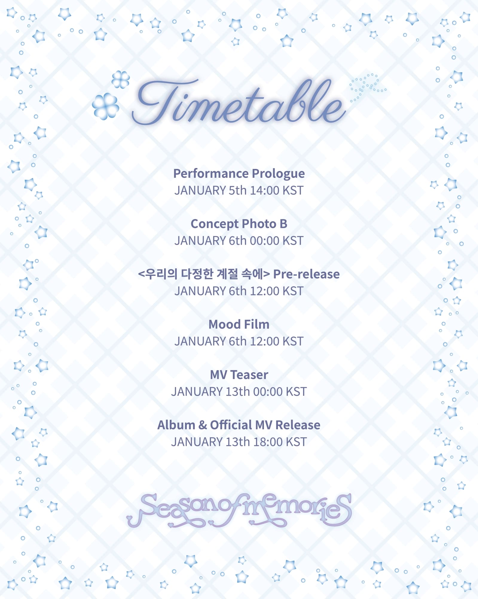 "OURTIMEHASBEGUNTOFLOWAGAIN"iMBC연예뉴스사진iMBC연예뉴스사진iMBC연예뉴스사진여자친구(GFRIEND)가신보타이틀곡선공개를하루앞두고곡제목과음원일부를깜짝오픈했다.5일정오여자친구(소원,예린,은하,유주,신비,엄지)와쏘스뮤직공식SNS에게재된스페셜앨범'SeasonofMemories'의트랙리스트에따르면,새음반에는타이틀곡'우리의다정한계절속에(SeasonofMemories)',유주와엄지가곡작업에참여한'Always'두곡이수록된다.타이틀곡'우리의다정한계절속에(SeasonofMemories)'는여자친구의지난발자취를돌아보는노래로,벅차오르는멜로디와박진감넘치는전개,아름답고서정적인가사로대표되는팀특유의감성을집약했다.여섯멤버는13일앨범정식발매에앞서6일정오이곡의음원을먼저선보이며오랜시간기다린팬들과대중에게반가움을안길예정이다.여자친구는5일오후2시하이브레이블즈유튜브채널에신곡음원일부를담은퍼포먼스프롤로그영상을업로드했다.이영상은'시간을달려서(Rough)'의엔딩포즈를취하는멤버들을비추다가"OURTIMEHASBEGUNTOFLOWAGAIN"이라는문구와함께검은화면으로전환돼새로운안무에대한궁금증을키웠다.이어경쾌하면서도아련한분위기의신곡반주일부가최초로공개됐다.짧은한소절임에도여자친구특유의음악색이드러나팬들의감정을소용돌이치게만들었다.여자친구는타이틀곡음원선공개당일(6일)0시두번째콘셉트사진을공개하고,정오스페셜앨범의무드필름으로컴백열기를한껏돋운다.앨범정식발매일(13일)0시타이틀곡뮤직비디오티저,오후6시에는뮤직비디오본편과전곡음원이베일을벗는다.한편여자친구는5일일본후쿠오카페이페이돔에서열리는'제39회골든디스크어워즈'에출연해화려한귀환을알린다.'골든디스크어워즈'는여자친구가신인상과베스트그룹상을받았던시상식으로,데뷔10주년을기념해다시이무대에올라의미를더한다.여자친구출연분은오는7일오전1시20분JTBC에서방송된다.iMBC연예백아영|사진출처쏘스뮤직Copyright©MBC연예.무단전재및재배포,AI학습금지.