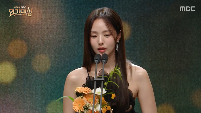 ‘2024MBC연기대상’.사진|MBC배우채수빈이우수연기상을수상했다.5일‘2024MBC연기대상’이녹화방송됐다.‘지금거신전화는’의채수빈이우수연기상을받았다.채수빈은“이런자리에오기전가슴아픈소식을전해서진심으로마음이아프고마음깊이애도를표한다”고말했다.이어“어릴때부터연기를꿈꿨는데TV를보며배우들이삶을살아가면서이삶도겪고저삶도겪는게멋진일이더라.작품하나하나가선물같이느껴졌다.나한테만국한된게아니라다른누군가에위로가되고기쁨이되고행복이될수있다는것에값지고감사한일이라는생각이든다.‘지금거신전화는’을통해가슴아픈사랑이야기경험해볼수있게해주셔서감사하다”고말했다.극중수어통역사역을맡았던채수빈은“이번작품서수어를배웠는데수어로한마디만해보겠다”며“드라마희주역할을통해서여러분들을만나서행복했습니다.사랑해주셔서감사합니다”라고시청자들에인사를건넸다.‘2024MBC연기대상’은‘밤에피는꽃’,‘원더풀월드’,‘수사반장1958’,‘우리,집’,‘백설공주에게죽음을-BlackOut’(이하‘백설공주’),‘이토록친밀한배신자’(이하‘이친자’),‘지금거신전화는’,‘나는돈까스가싫어요’,‘세번째결혼’,‘용감무쌍용수정’,‘친절한선주씨’등MBC에서방송된드라마를총결산하는자리다.대상후보는‘밤에피는꽃’이하늬,‘월더풀월드’김남주,‘수사반장1958’이제훈,‘우리,집’김희선,‘백설공주’변요한,‘이친자’한석규,‘지금거신전화는’유연석이다.[김소연스타투데이기자]Copyright©스타투데이.무단전재,재배포및AI학습이용금지
