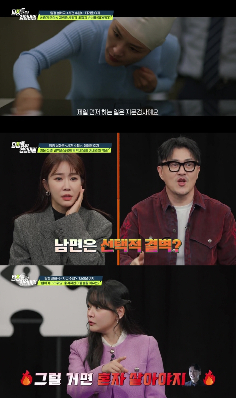 사진=채널A‘탐정들의영업비밀’제공데프콘이결벽증을가진두얼굴의남편사연에분노했다.16일방송된채널A‘탐정들의영업비밀’의‘탐정24시’에서는뮤지컬배우김소현이실화재구성코너‘사건수첩-더러운여자’에게스트로함께했다.이날사연의의뢰인은완벽한애처가남편과가정을꾸린딸의불륜을의심하는친정어머니였다.사연속남편은연매출100억대의화장품회사를경영하는CEO였다.탐정의추적결과아내쪽이오피스텔에드나드는것은맞았지만,그는부동산중개업자부부와함께사용하는공유오피스텔에서빨래와샤워등을해결하고있었다.알고보니아내는‘애처가’로소문난남편의지독한결벽증때문에집에서가족초대도,빨래도할수없는상황이었다.심지어어린딸조차“엄마가더럽다.소독해야한다”며몇번이나손을닦는강박증과결벽증세를보이고있었다.데프콘은“이게사람이냐,가축이지”라며격분했다.사연속탐정은이혼을권유하며아내에게‘홈캠’녹화와함께객관적으로상황을보라고추천했다.아내는남편이오면수영모를쓰고머리카락을가렸고,남편이뿌리는소독제에범벅된상태로지문조차용납하지않는모욕적인청결검사를일상적으로요구당하고있었다.결국아내쪽에서이혼소송을시작했고,침착하게남편의불륜증거를모아단번에유리한합의에성공했다.남편은아내에겐강박적인청결을요구하며모멸감을선사했지만,술자리나개인오피스텔에서는여자를불러내고거리낌없이진한스킨십을나눠분노를유발했다.‘탐정들의영업비밀’은매주월요일밤9시30분채널A에서방송된다.이주인기자[email protected]©일간스포츠.무단전재및재배포금지.