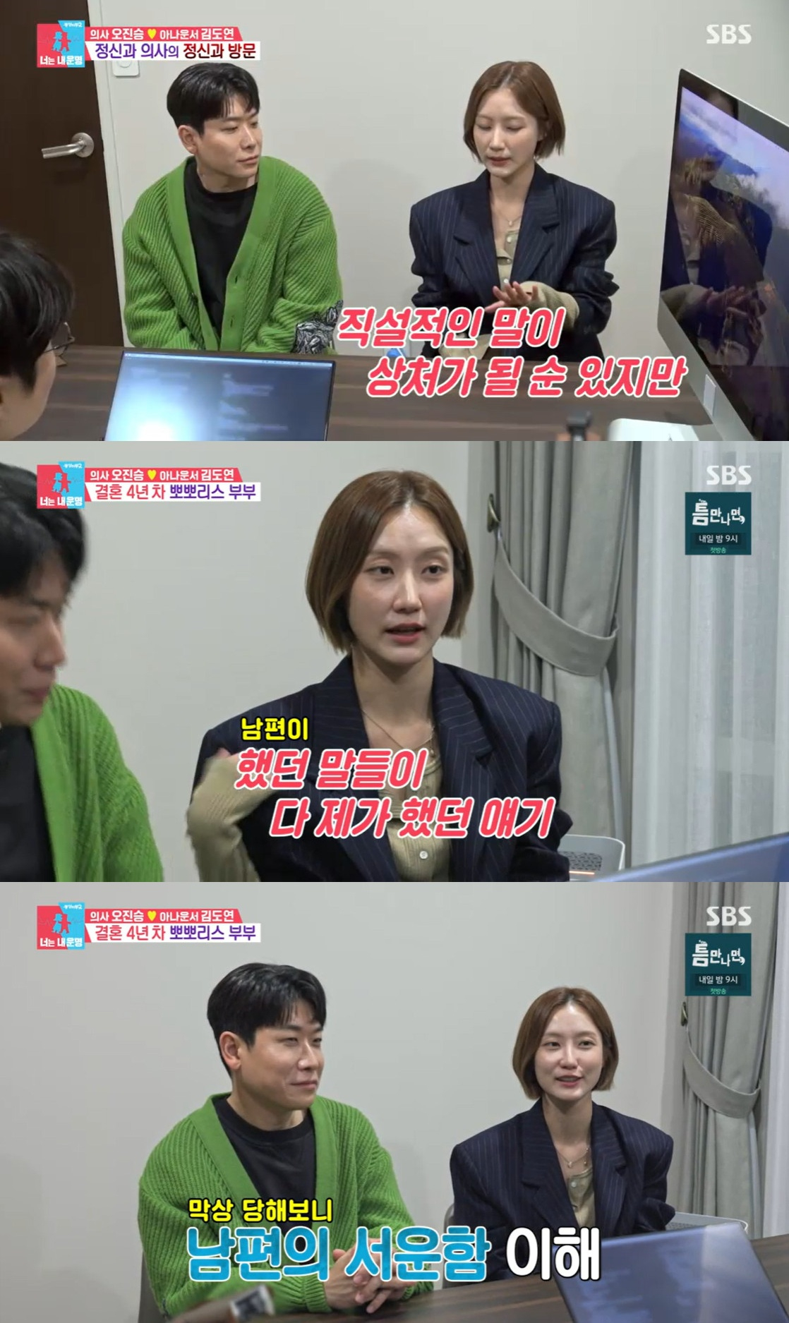 [스타뉴스|안윤지기자]/사진=SBS예능'동상이몽2너는내운명'방송캡처'동상이몽2'오진승의사와김도연아나운서가그간의문제에사과했다.15일방송된SBS예능'동상이몽2너는내운명'(이하'동상이몽2')에서는오진승,김도연부부의일상이공개됐다.오진승,김도연부부가정신과를방문했다.오진승은"부부관계이기때문에혼자만진단하는게어렵다"라고했고,김도연은"남편이나한테거짓말하고이런게은근히재밌다.나랑대화하고싶구나하는마음이있지만문제는유튜브촬영장가서실장님한테도그러고그러니까대외적인이미지가문제된다.본인은관심끌고싶어서그렇다는데이미유튜브도하지않나.얼마만의관심을끌고싶어서그러나싶다"라고털어놨다.이어오진승은"아내는직설적인편이다.싫다,안한다는얘기를들었을때평상시엔넘어가도이런얘기가상처라든가섭섭하게들릴때도있다"라고했고,김도연은"내가직설적으로말하는게상처일수있지만우리가헤어질게아니고100세까지살아야하지않나.바로바로말하는게건강한관계라고생각한다.회피하고싶어한다.난답답하다"라고토로했다.두사람은거울치료를시작했다.뽀뽀거절에대한내용을말한후,김도연은"오빠가한말이내가했던말이다.이사람이싫어서,남자로느끼지않아서그런게아니었다.이렇게말하니핑계같이들렸다.여기서상처를받을수있겠다는생각이들었다"라고답했다.오진승도"비슷한연기를했다.내가좀장난처럼한다.담백한느낌이아니라이것저것말도많이하고하니까"라고했다.한편'동상이몽2'는매주월요일오후10시10분에방송된다.안윤지기자[email protected]©스타뉴스&starnewskorea.com,무단전재및재배포금지