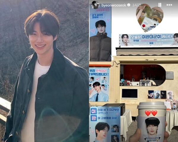 ⓒ변우석SNS[스포츠한국신영선기자]배우변우석이팬들의뜨거운응원에화답했다.변우석은12일자신의인스타그램에팬클럽이보낸커피차인증샷을공개했다.사진속커피차에는변우석의다양한스틸컷과함께"오늘은이안대군이쏩니다","우리우석대군잘부탁드립니다"등응원문구가빼곡히담겨눈길을끈다.드라마속캐릭터'이안대군'을전면에내세운센스있는문구와정성스럽게꾸며진현장은팬들의애정을고스란히전한다.또다른사진에서는변우석의얼굴이프린트된커피컵을손에들고있는모습도포착됐다.팬들이준비한맞춤형디자인과세심한구성은현장분위기를한층훈훈하게만들며,변우석을향한든든한지원사격을실감케한다.한편변우석은차기작'21세기대군부인'에서이안대군역으로시청자들과만난다.'21세기대군부인'은21세기입헌군주제대한민국을배경으로,모든것을가졌지만신분이평민이라답답한재벌성희주(아이유분)와왕의아들이지만아무것도가질수없는남자이안대군(변우석분)이운명과신분의벽을넘어사랑을개척해나가는로맨스다.작품은2026년MBC와디즈니플러스코리아를통해방송될예정이다.스포츠한국신영선기자[email protected]©스포츠한국.무단전재및재배포금지.