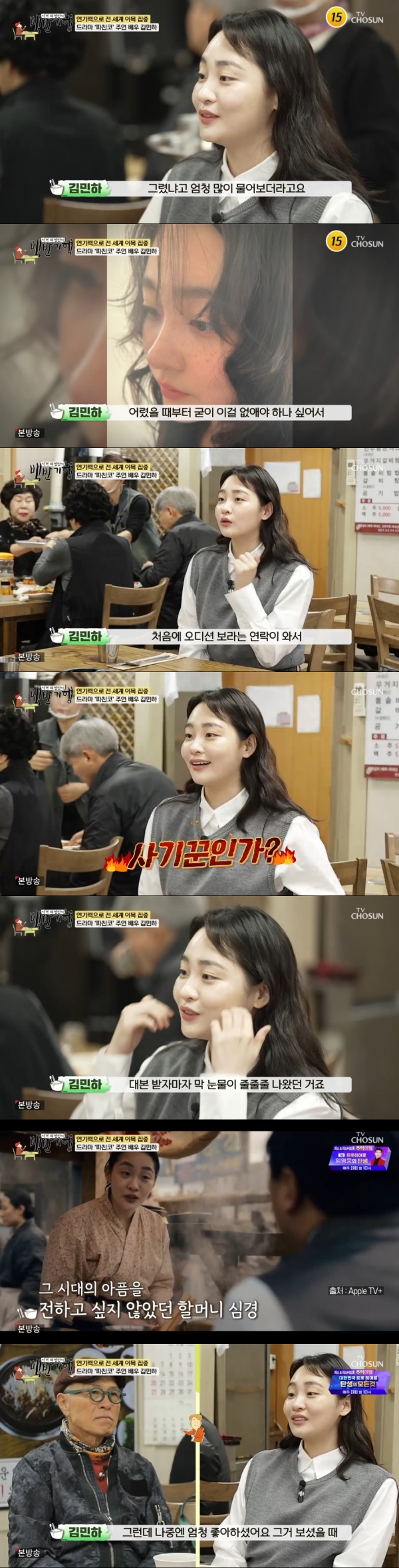 사진=TV조선[스포츠투데이김태형기자]배우김민하가'파친코'에얽힌비하인드를밝혔다.1일방송된TV조선'식객허영만의백반기행'(이하'백반기행')에는글로벌화제작'파친코'의배우김민하가출연했다.이날김민하는허영만과함께천안서북구맛집을탐방했다.김민하는"서울에서태어났는데분당에서살았다.분당에서살다가고등학교때다시서울로넘어왔다.지금은엄마,아빠랑살고있다.엄마,아빠랑살수있을때까지살아보려한다"고말했다.허영만은"얼굴에주근깨는그린건가"라고물었다.김민하는"아니다.원래있다"며"그린거냐고많이물어보더라.가리려면가려지는데어렸을때부터굳이이걸왜없애야되나싶었다"고밝혔다.김민하는애플TV+'파친코'를통해전세계적으로주목받는배우가됐다.그는"미국드라마인데한국의이야기"라고설명하며"오디션보라는연락이와서'사기꾼인가?'했다"고비하인드를밝혀웃음을자아냈다.김민하는"오디션대본을받았는데받자마자눈물이났다.오디션대본차제가실화를바탕으로했다"고설명했다.처음에는할머니가'파친코'출연을탐탁지않아했다며"확정되고나서할머니한테많이여쭤봤다.'파친코'선자와나이대가비슷하시다.'이걸왜자꾸물어보냐'하셔서이런역할이됐다고하니까할머니가'안하면안되냐'했다.자기는너무가슴아파서모르겠다더라.내손녀딸이그렇게힘든역할을하면연기여도그걸실제로겪어야하는줄아시니까"라고이야기했다.이어"저는할머니이야기를듣는시간과어땠을지혼자상상하는시간이되게두터웠다.할머니한테도보여드리면처음엔못보겠다고하시더라.근데나중에는엄청좋아하셨다"고밝혔다.[스포츠투데이김태형기자[email protected]]Copyright©스포츠투데이.무단전재및재배포금지.